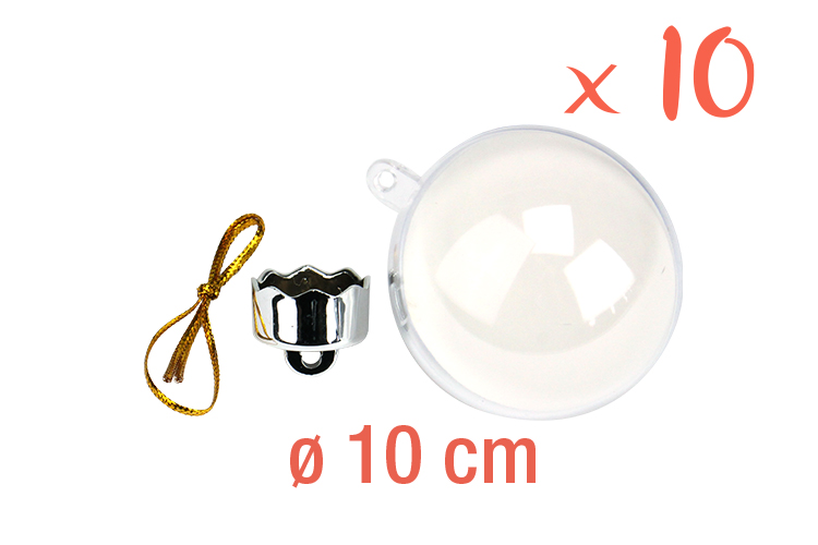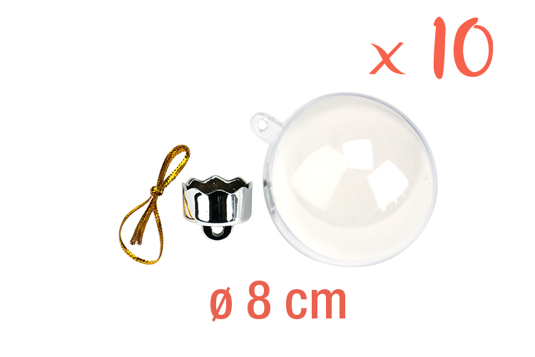 Each transparent plastic ball consists of 2 half-spheres that fit into each other, a card to decorate, its cap, and a golden cord for hanging.