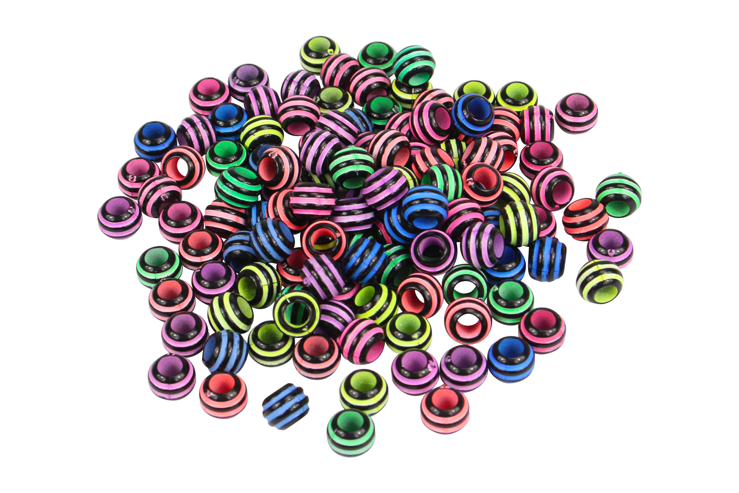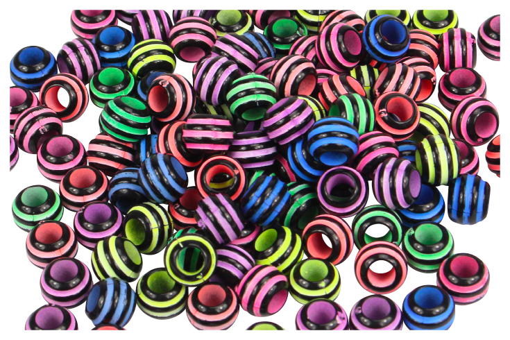 Acrylic beads featuring alternating black stripes and brightly colored bands.