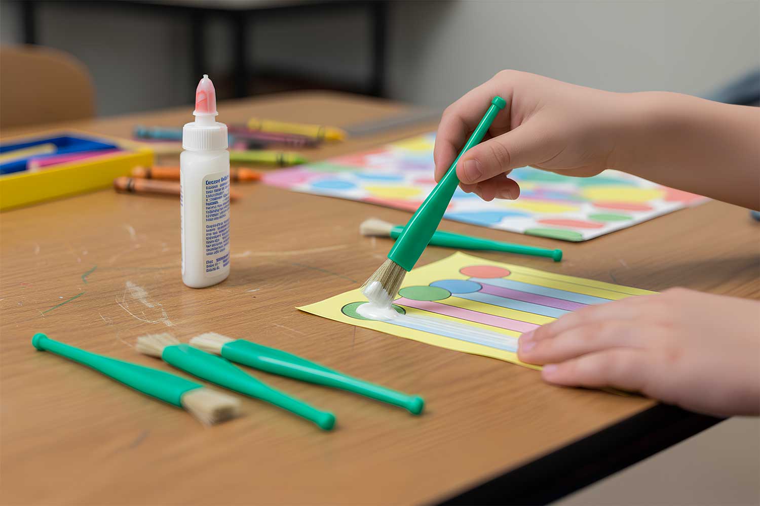 Wide brush with a plastic handle and thick synthetic bristles. Perfect for use with varnishes, glues, or applying glue varnish. Its small plastic handle allows for a good grip for smaller hands.