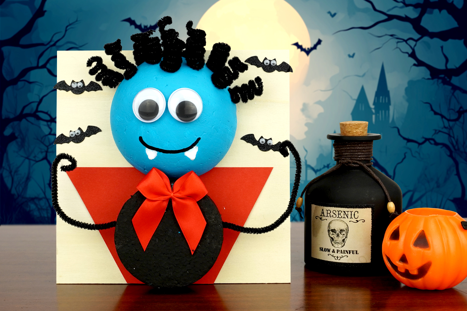 Using a half foam ball and a foam disc, children can create a 3D vampire, decorating it with googly eyes, a large satin bow, and black pipe cleaners for hair.
