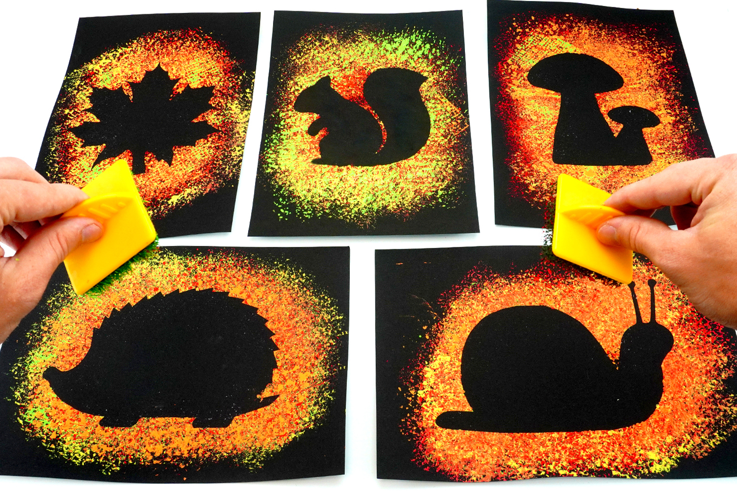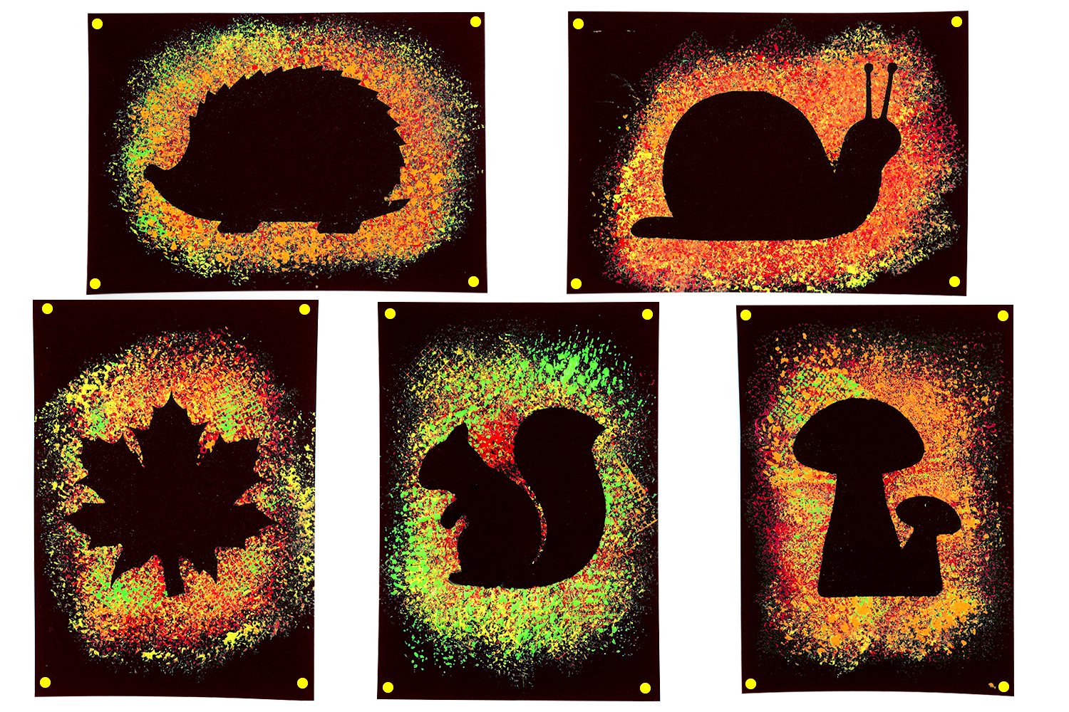 In this Autumn craft activity, we will show you how to create beautiful silhouettes of hedgehogs, snails, squirrels, mushrooms, or even autumn leaves using paint and textured stamps.