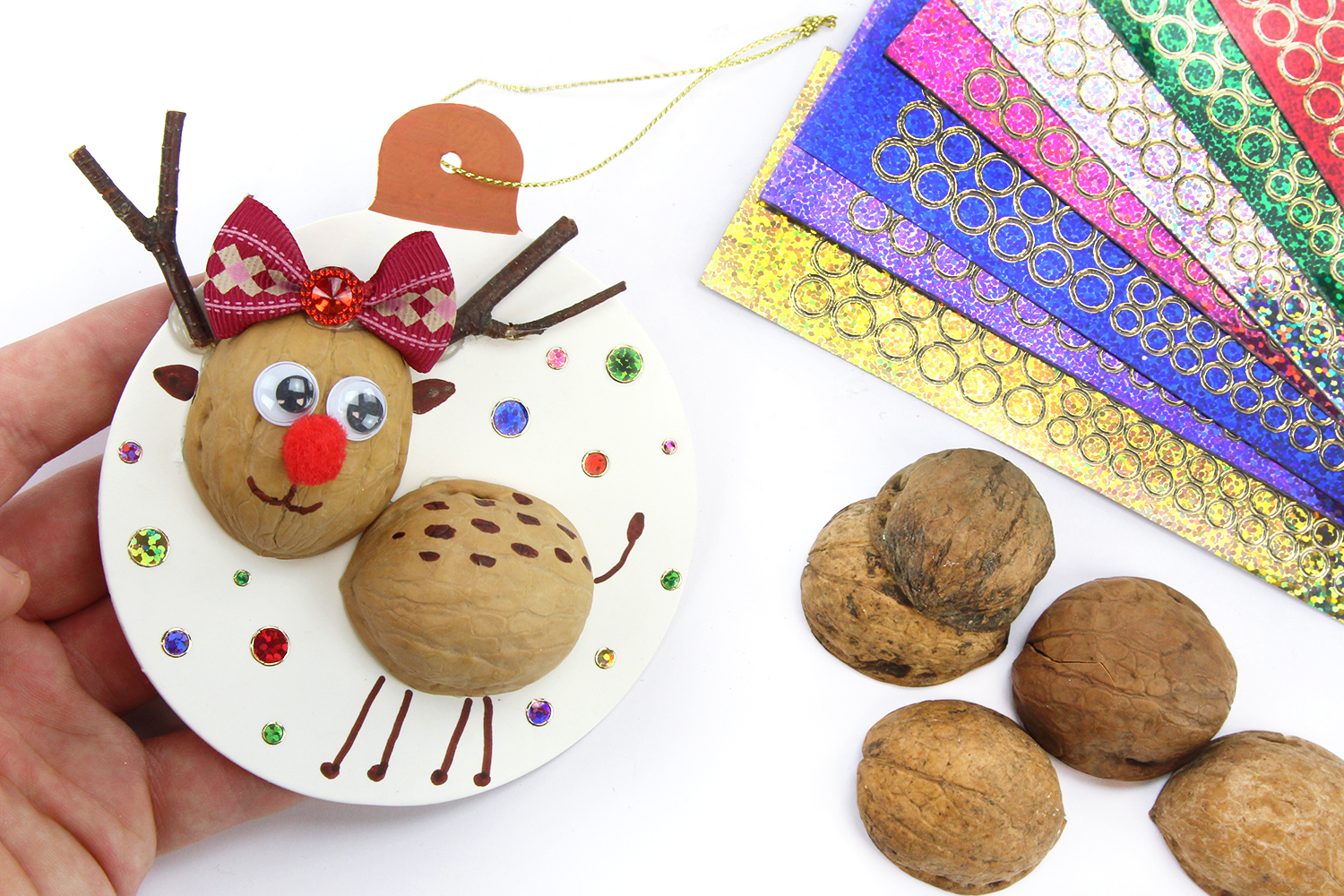 In this activity, children will have fun creating original ornaments for the tree using walnut shells. With these walnut shells and a few twigs, it will be possible to make beautiful 3D reindeer that can be glued onto cardboard balls to hang them on the Christmas tree.