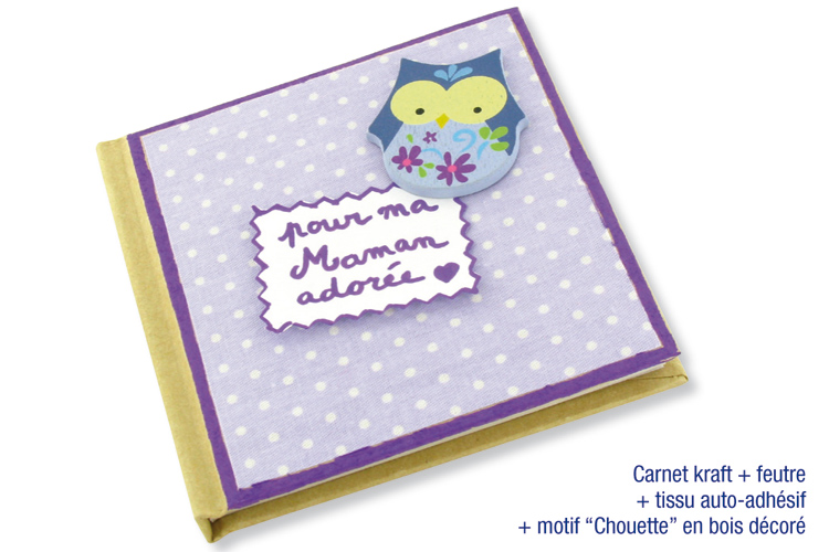 Notebook covered with self-adhesive fabric + decorated wooden owl...
