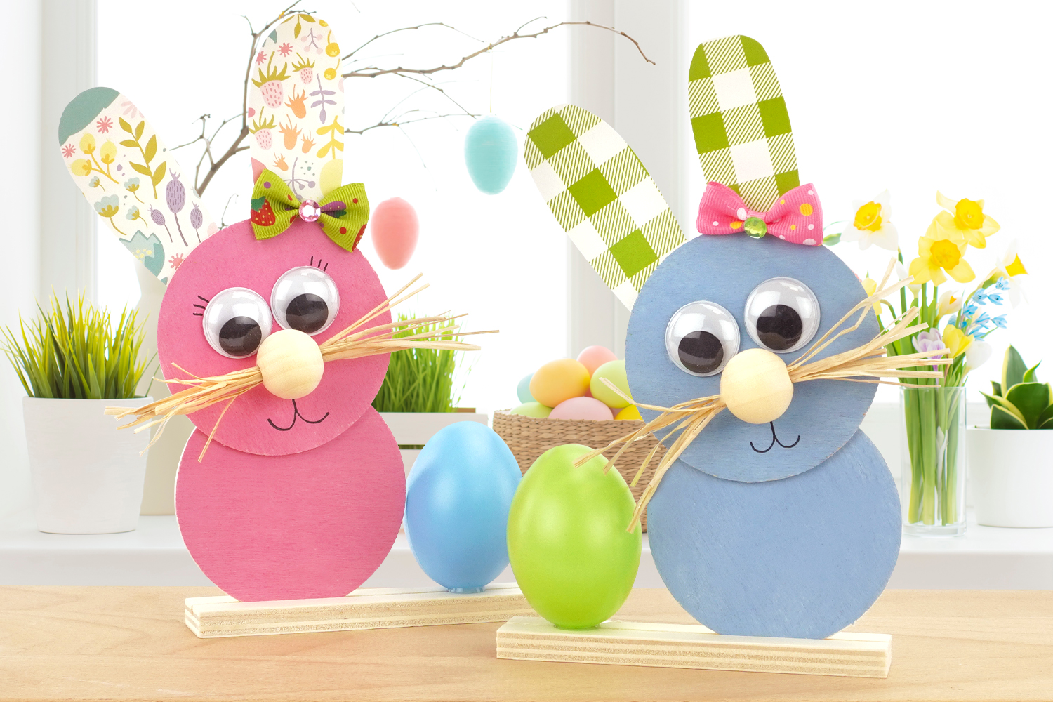 To achieve this, they will use small round wooden supports, patterned paper, accessories, and natural raffia to create lovely whiskers for these little bunnies.