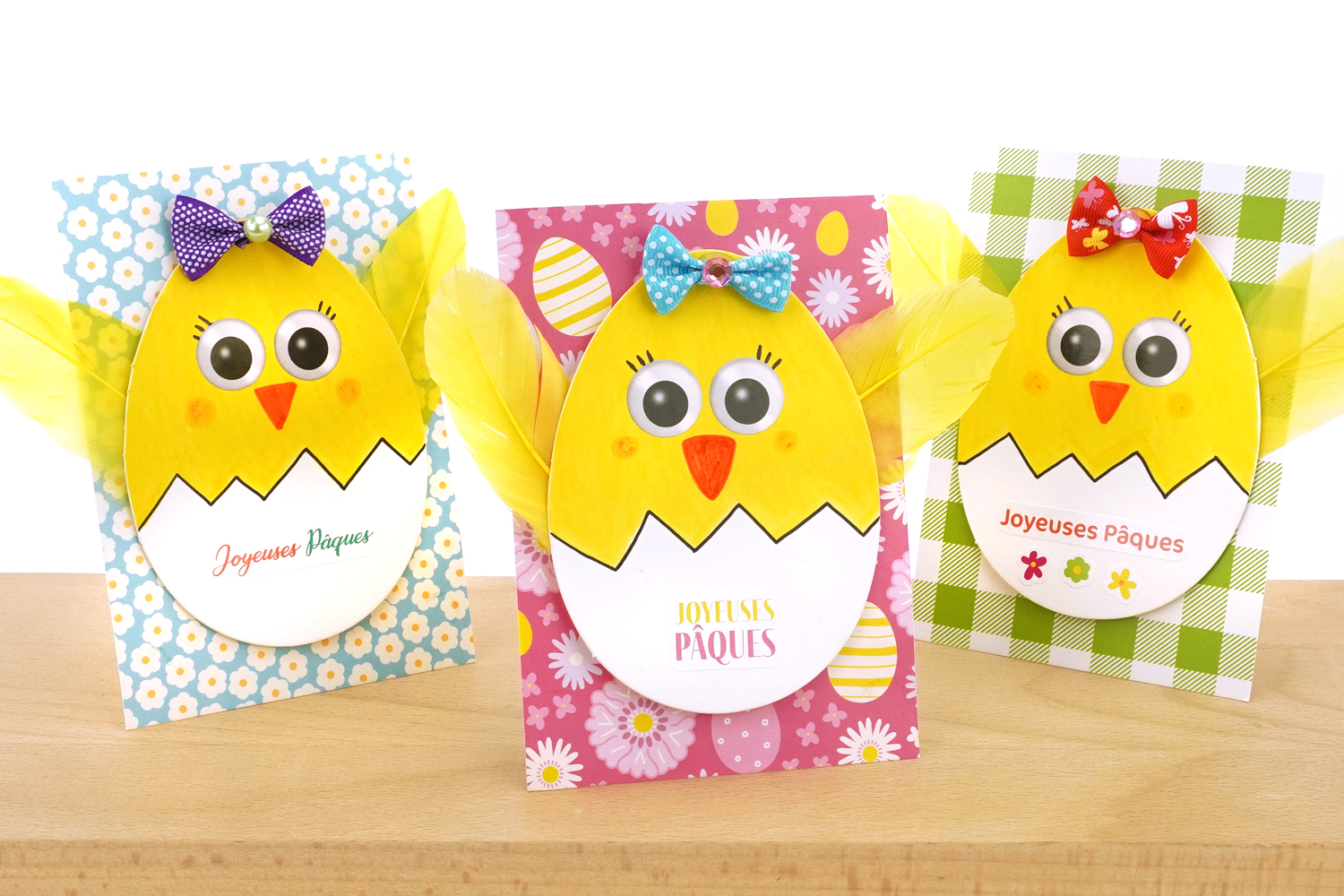 Cut a patterned cardstock into 4 pieces and then stick the chick in the center using adhesive dots.