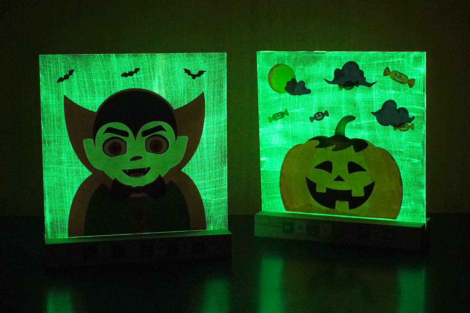 Choose your Halloween character (vampire, pumpkin, monster, skeleton) and then stick the stickers on the unpainted side of the acrylic sheet.