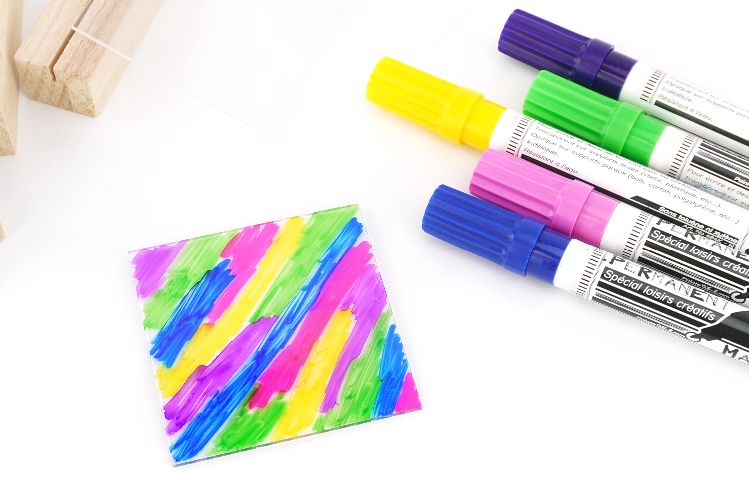 Draw solid colors on the plexiglass surface using permanent markers. The patterns don’t matter much, the result will be original and unique in the end!