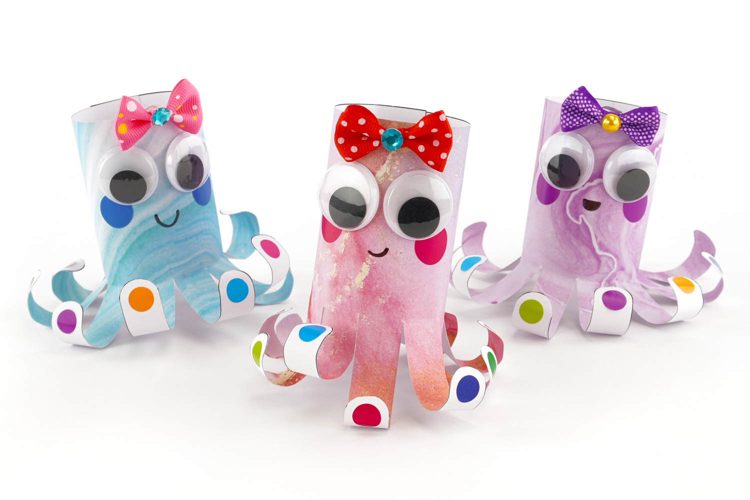Discover a colorful and easy activity to create an adorable paper octopus. Using a downloadable template, children cut, roll, and decorate their creation with googly eyes, round stickers, and small fabric bows. With its funny tentacles and big mischievous eyes, this whimsical octopus will allow little artists to develop their dexterity while letting their imagination run wild!