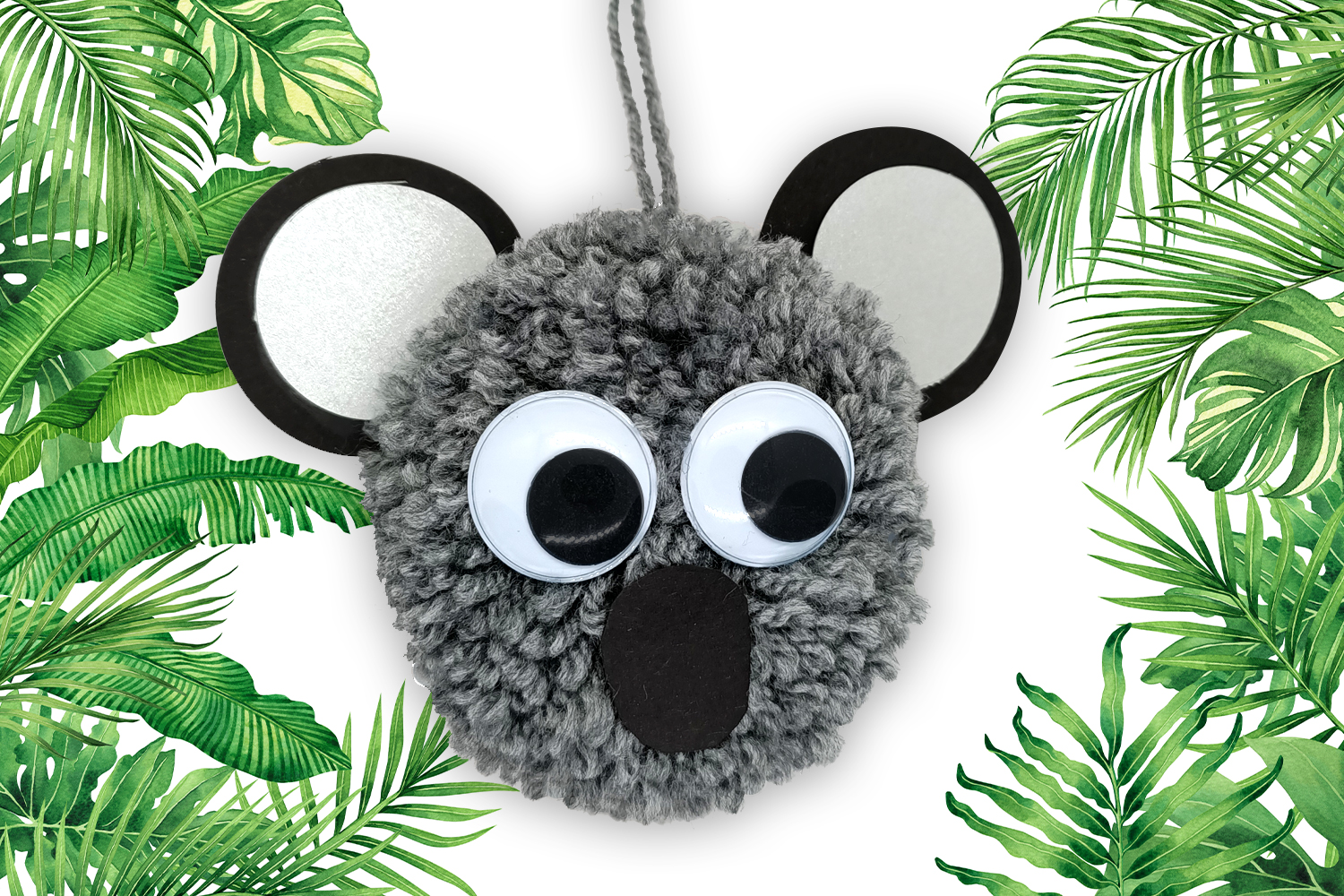 To make a koala you will need a koala pom-poms kit. Kit contents: 3 balls of grey wool, 4 tools for making pom-poms, 24 google eyes Ø 2.5 cm, 10 black sturdy cards, 10 silver sturdy cards, a tube of white glue, and a pair of precision scissors.