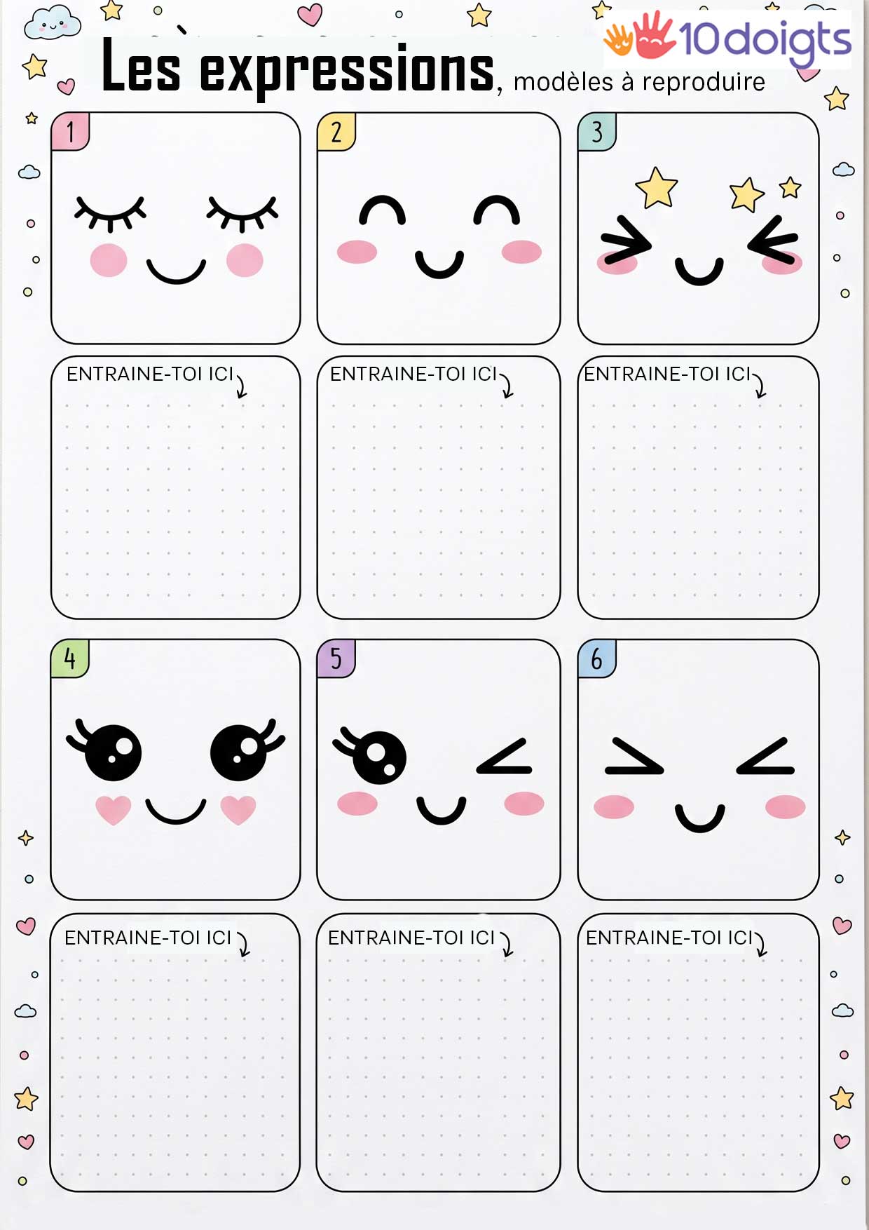 Le petit plus pour réussir à coup sûr : Nous mettons à votre disposition un fichier gratuit à télécharger. Ce document contient une multitude de modèles d'expressions kawaii à reproduire facilement. Il suffit d'imprimer, de choisir votre visage préféré et de vous lancer !