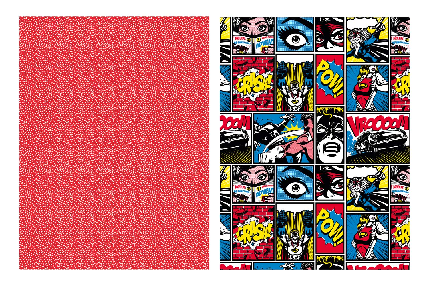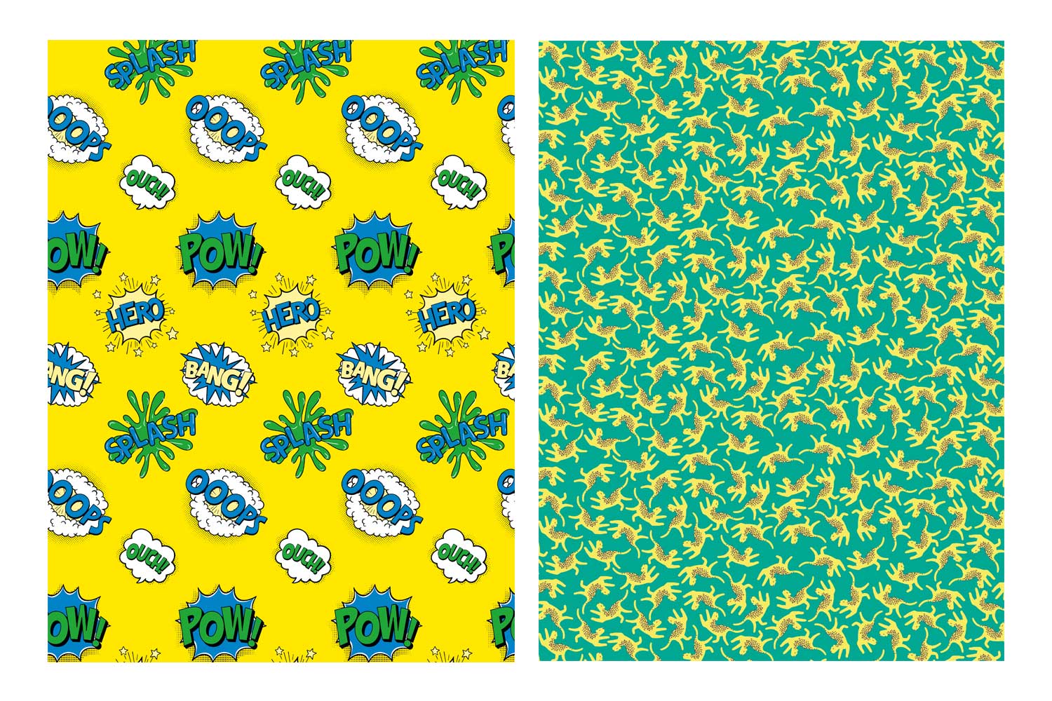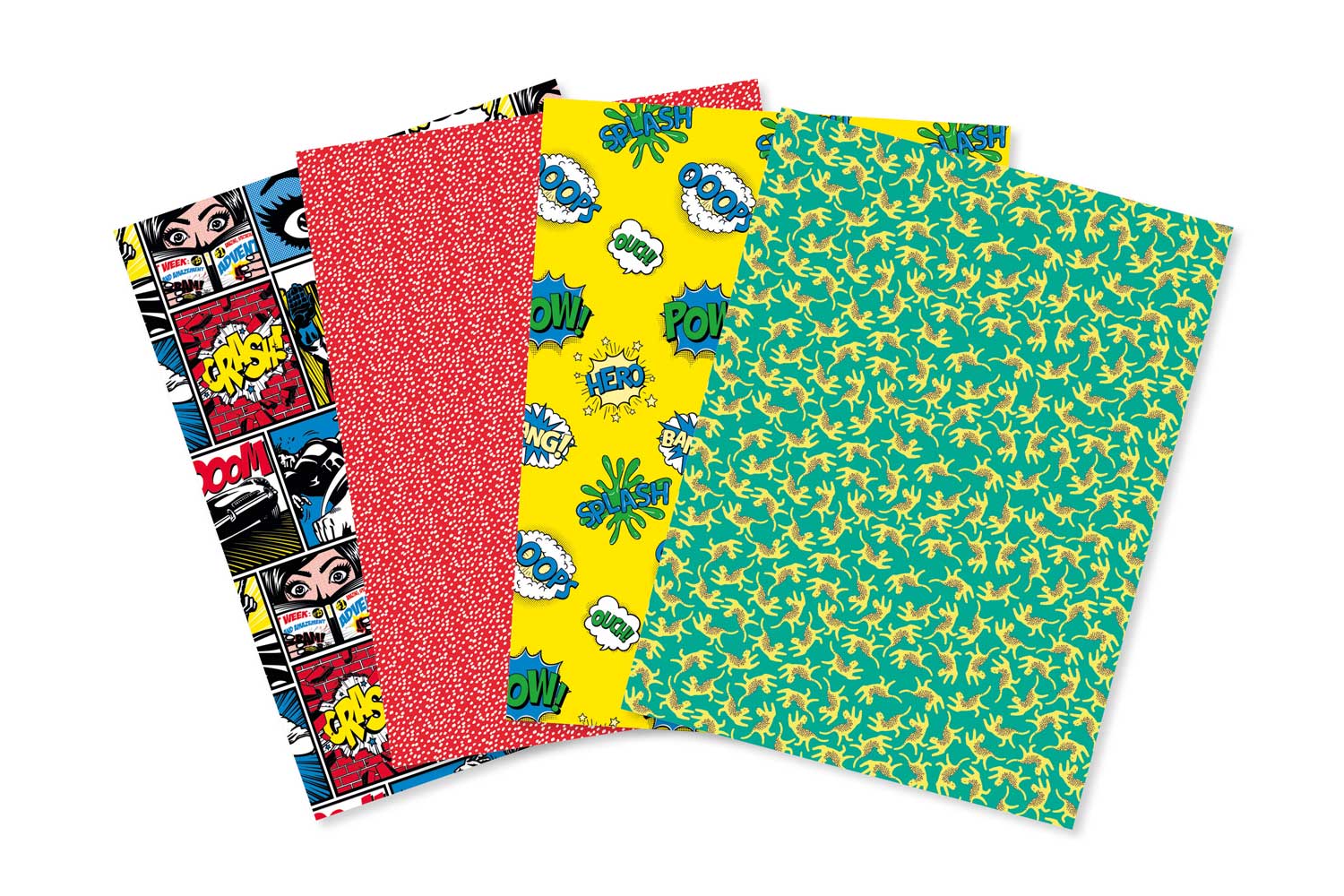 - 4 sheets 30 x 40 cm: 1 sheet with comic strip patterns, 1 sheet red with white polka dots, 1 sheet yellow with comic expression bubbles, 1 sheet green with fluorescent yellow panthers.