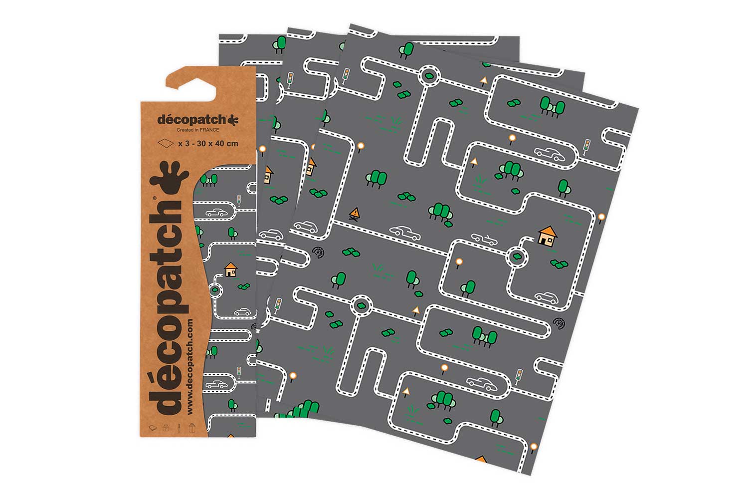 Gray Decopatch paper with racing circuit patterns. Pack of 3 identical sheets.