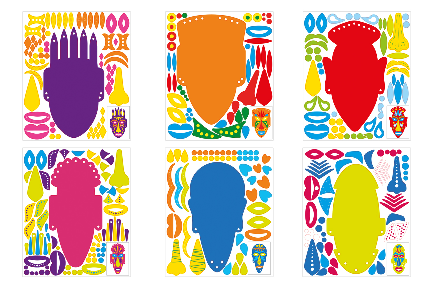 - 6 sturdy cardboard sheets, each featuring 1 mask and detachable shapes for gluing.