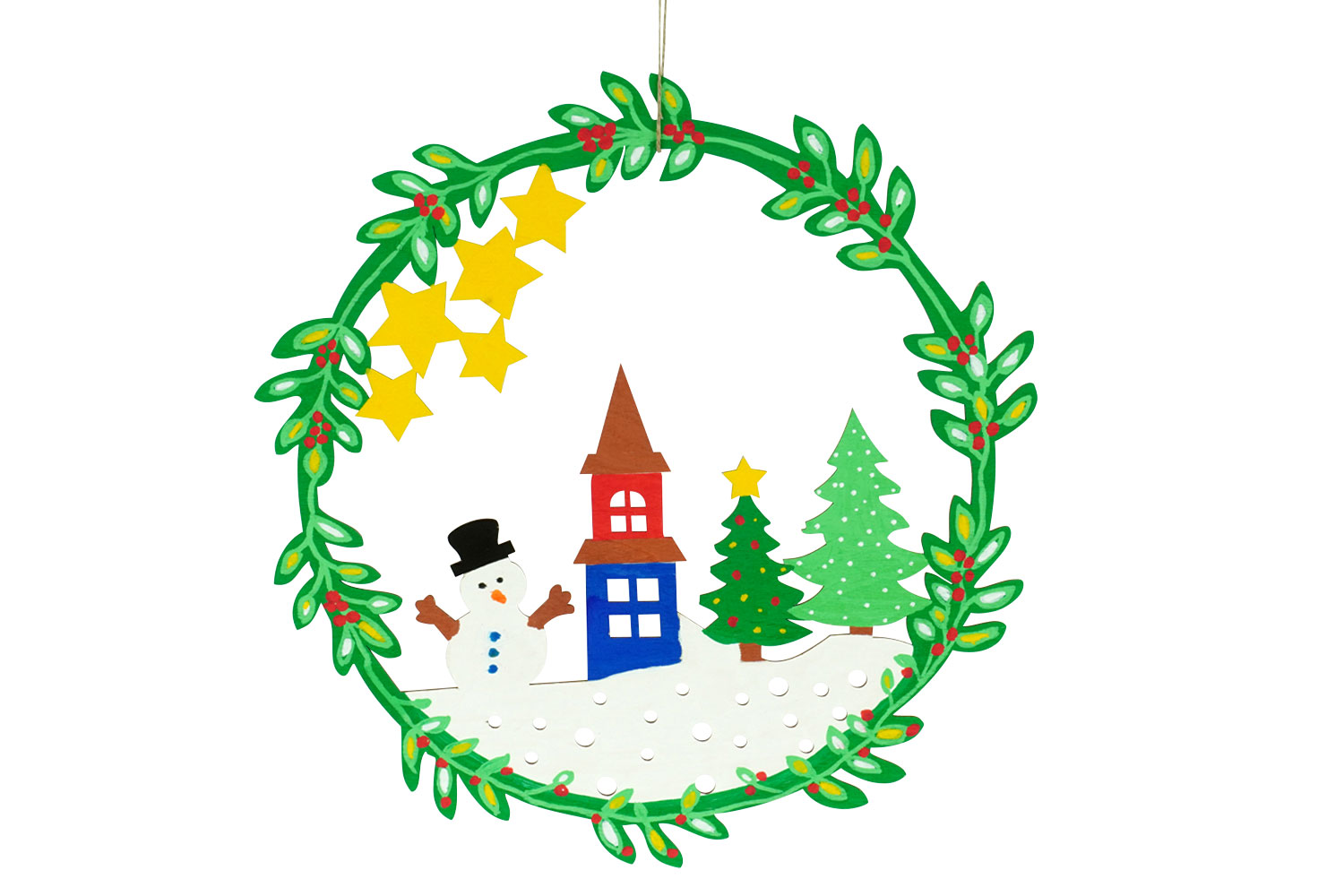 Beautiful Christmas wreath made of cut-out wood, ready to paint and varnish, perfect for decorating your front door or the walls of your home during the festive season. Its design, adorned with fir trees, a church, and a snowman, perfectly complements the spirit of Christmas. Comes with a cord for easy hanging