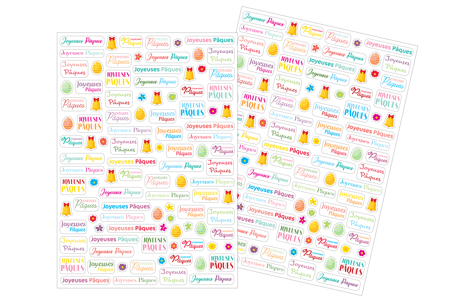 Sticker sheets featuring Easter decorations and messages saying "Happy Easter" in matching colors on a white background. Convenient for decorating your Easter crafts or embellishing a card.