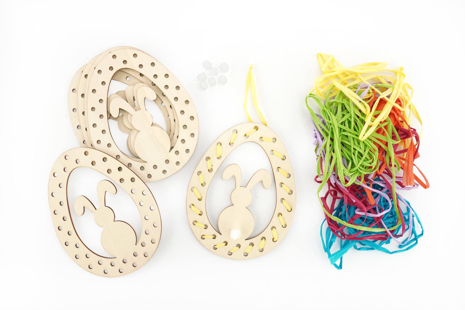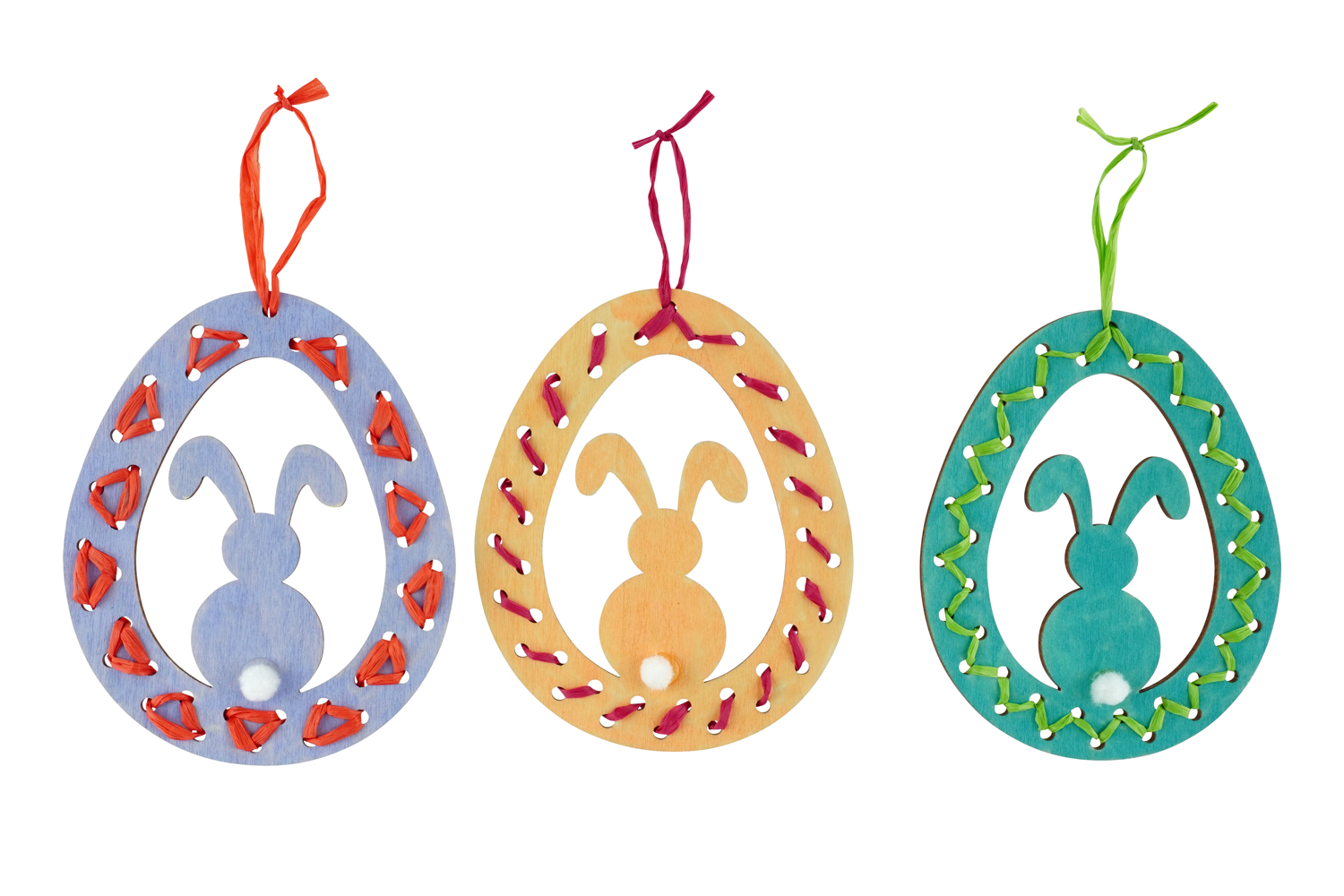 Add a handmade touch to your Easter decorations with these adorable wooden hangings. The little bunny and its pom-pom tail make these creations perfect for decorating an Easter tree or a festive space.