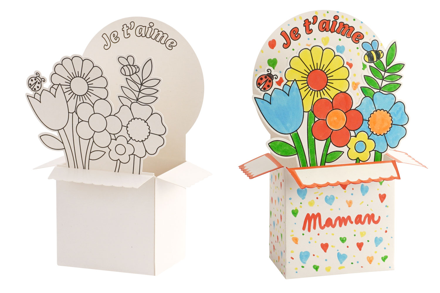 What does this coloring and assembling activity involve? The child starts by coloring the flower bouquets and the "I love you" backgrounds according to their inspiration, making each box unique. Once coloring is complete, simply assemble the sturdy card boxes and glue the various elements to reveal a stunning 3D bouquet. For even stronger personalization, you can stick a photo on the front of the box!