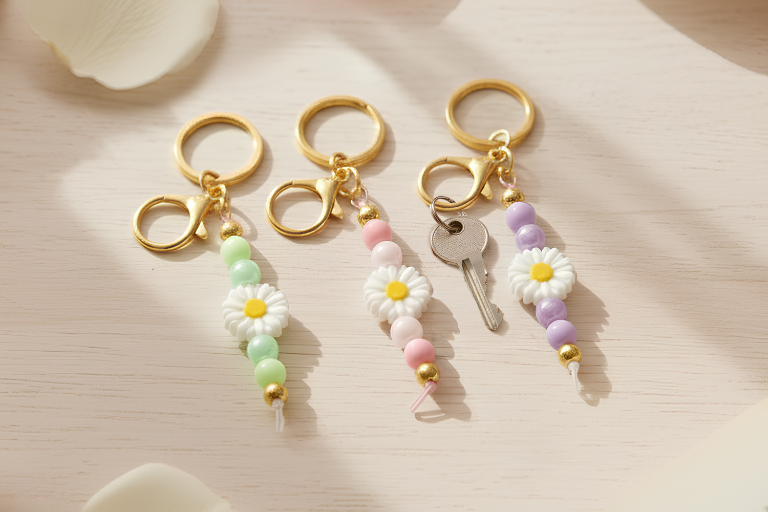 The main pieces of this kit are the three large daisy flower silicone beads. This "soft" material provides a pleasant and modern texture that differs from classic beads. Each creation is mounted on a golden metal ring equipped with a sturdy carabiner.