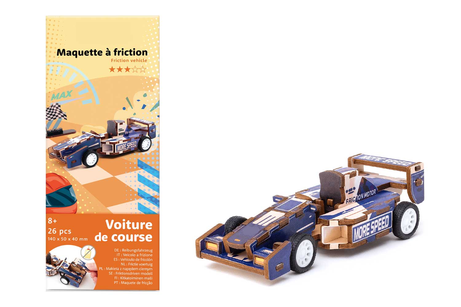 Excite speed enthusiasts with this wood friction model kit featuring a stylish race car. Perfect for ages 8 and up, this clever model is easy to assemble with pre-cut wooden pieces and an effective friction mechanism. No glue or complicated tools are needed. A simple pull allows the car to start on its own, providing a delightful surprise and fun.