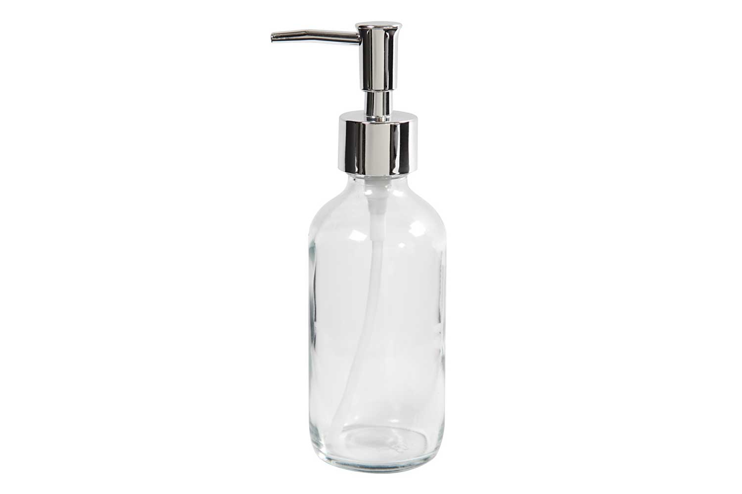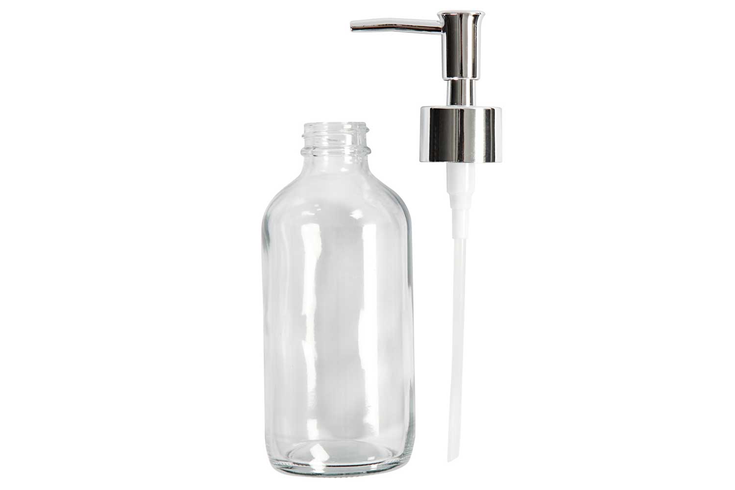 Glass bottle and metal-colored plastic pump for liquid soap. Decorate this soap dispenser with paint, glass markers, decoupage papers, rhinestones, or dried flowers. Customize your bathroom or kitchen with this clear bottle for decoration. Sold without soap.