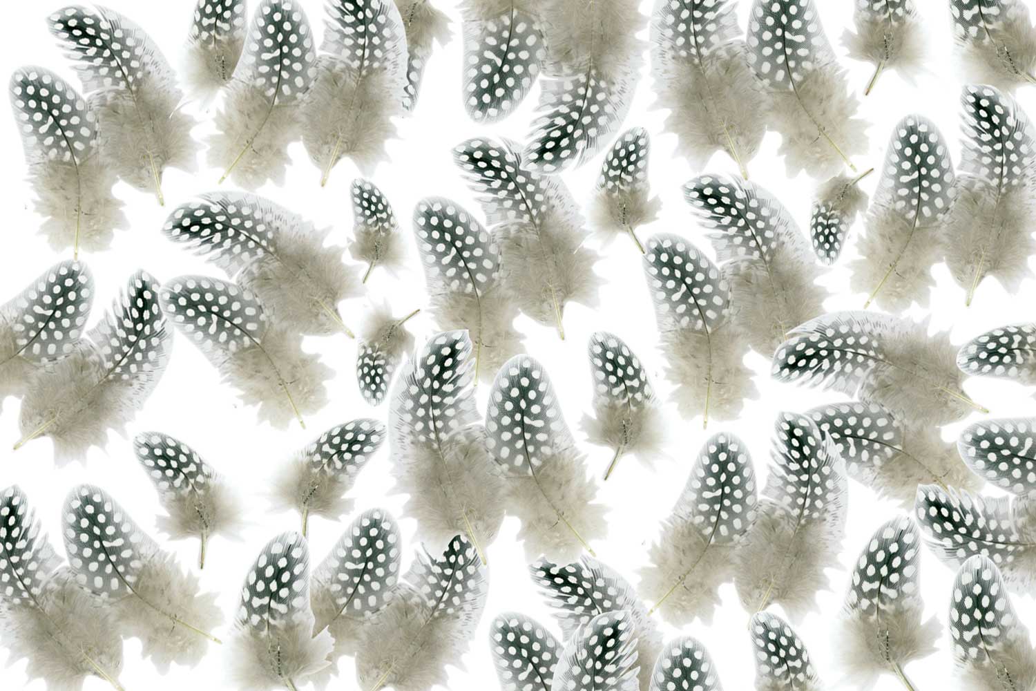 Natural spotted feathers in shades of gray, white, and black. A classic for decoration and creative activities.