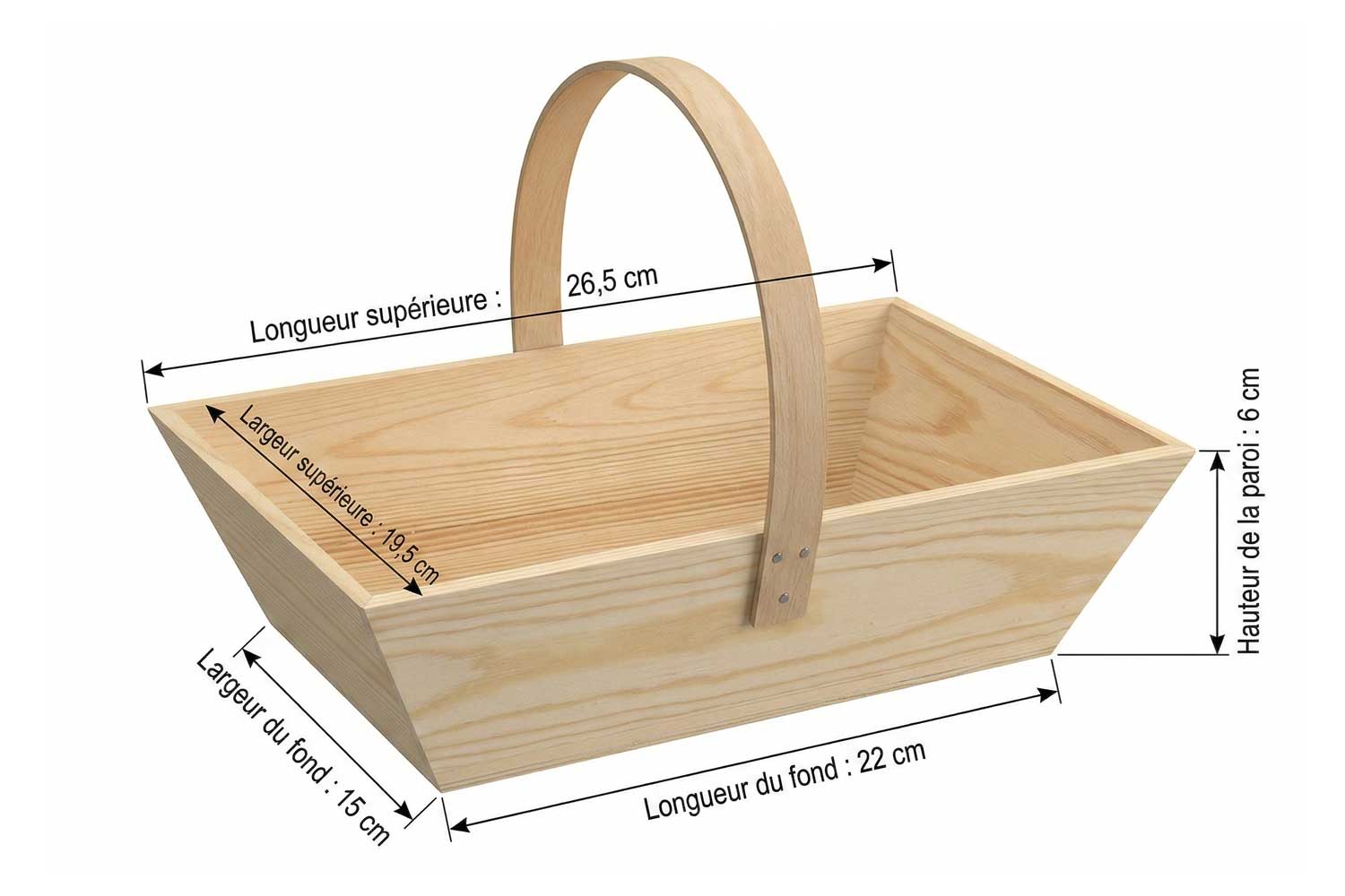 Large rectangular wooden basket with a handle. Ideal for Easter egg hunts or for collecting candies at Halloween.