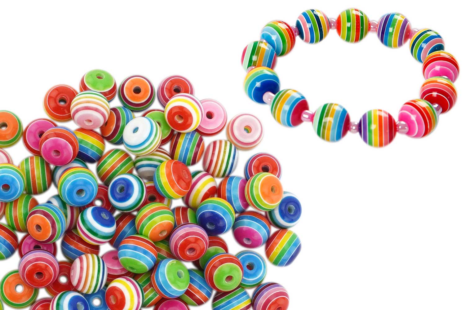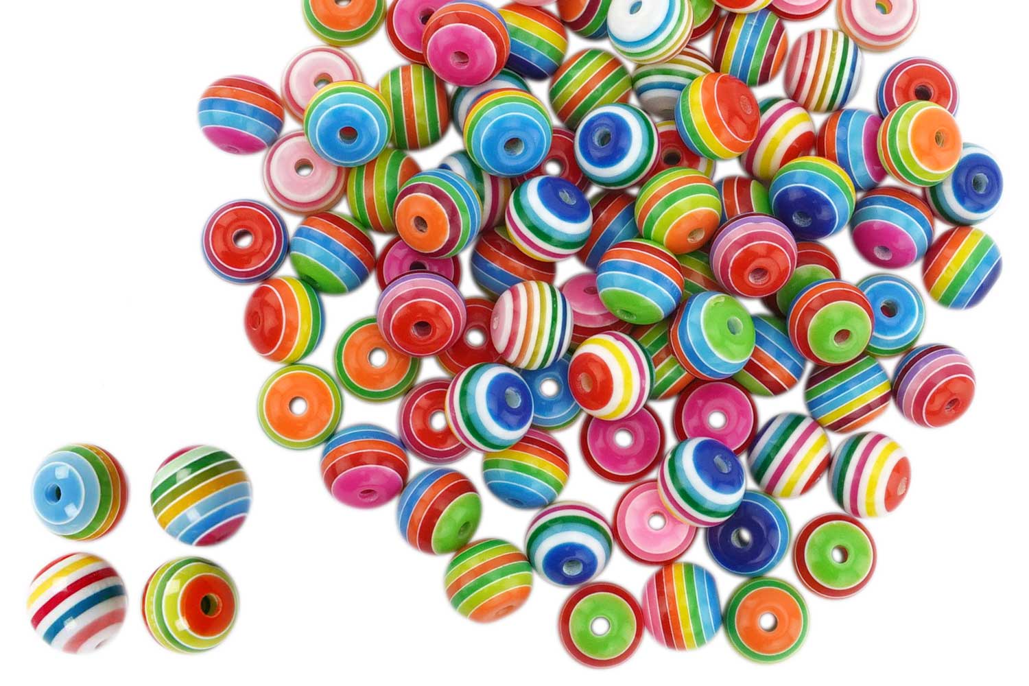 Round beads made of colored resin, featuring multicolored stripes. Of very high quality, these beads are highly shiny, and the colors are vivid.