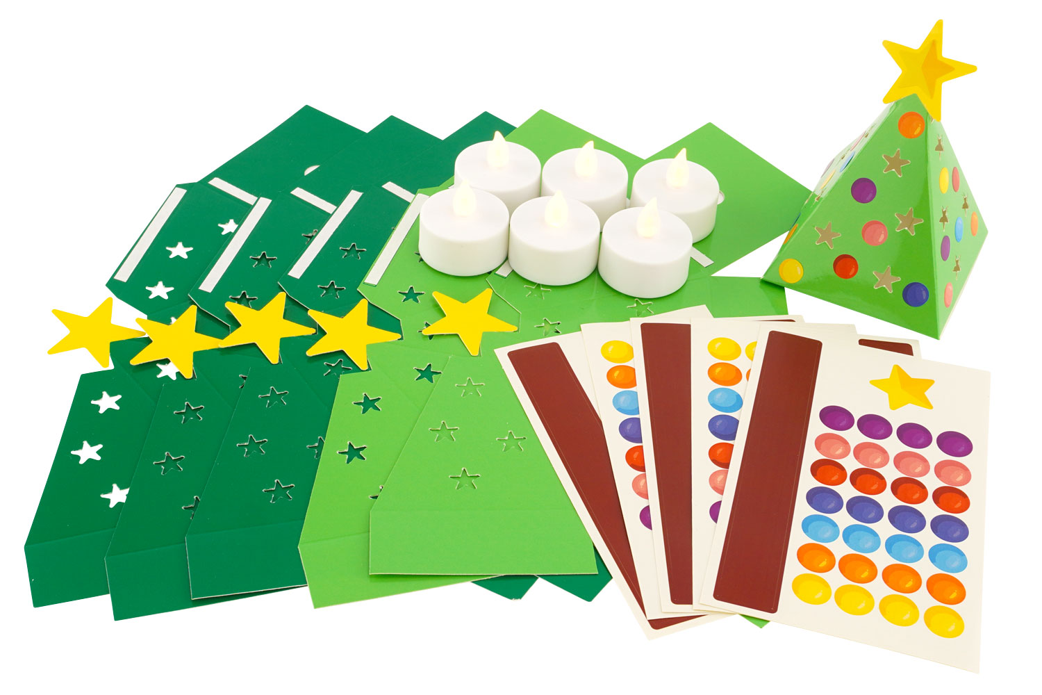 Effortlessly create sparkling Christmas trees with this all-inclusive creative kit! These small cardboard trees can be assembled in no time, adorned with colorful stickers as desired, and then illuminated by a battery-operated LED candle included, which is flame-free and safe. This simple, creative, and secure hands-on activity is perfect for family workshops, classrooms, or recreational centers.