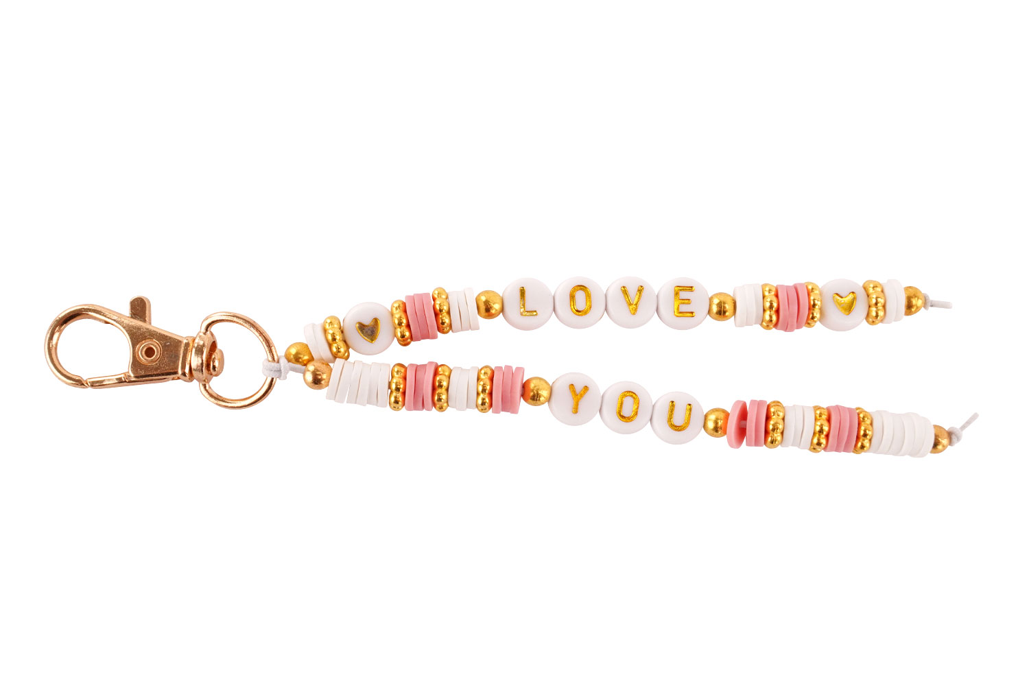 - Pink and white heishi beads, gold spacer beads, and "LOVE YOU" alphabet beads (x 2)