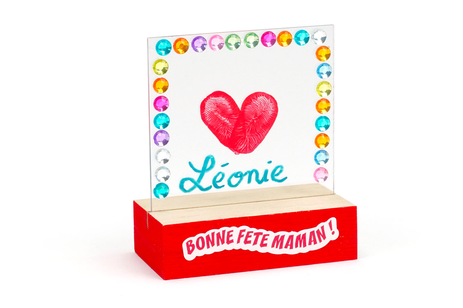 An original support made of a thick transparent plexiglass plate and a removable wooden base to create personalized and creative frames. This support is perfect for capturing children's fingerprints using paint. A cute gift that will charm all parents for their celebrations!