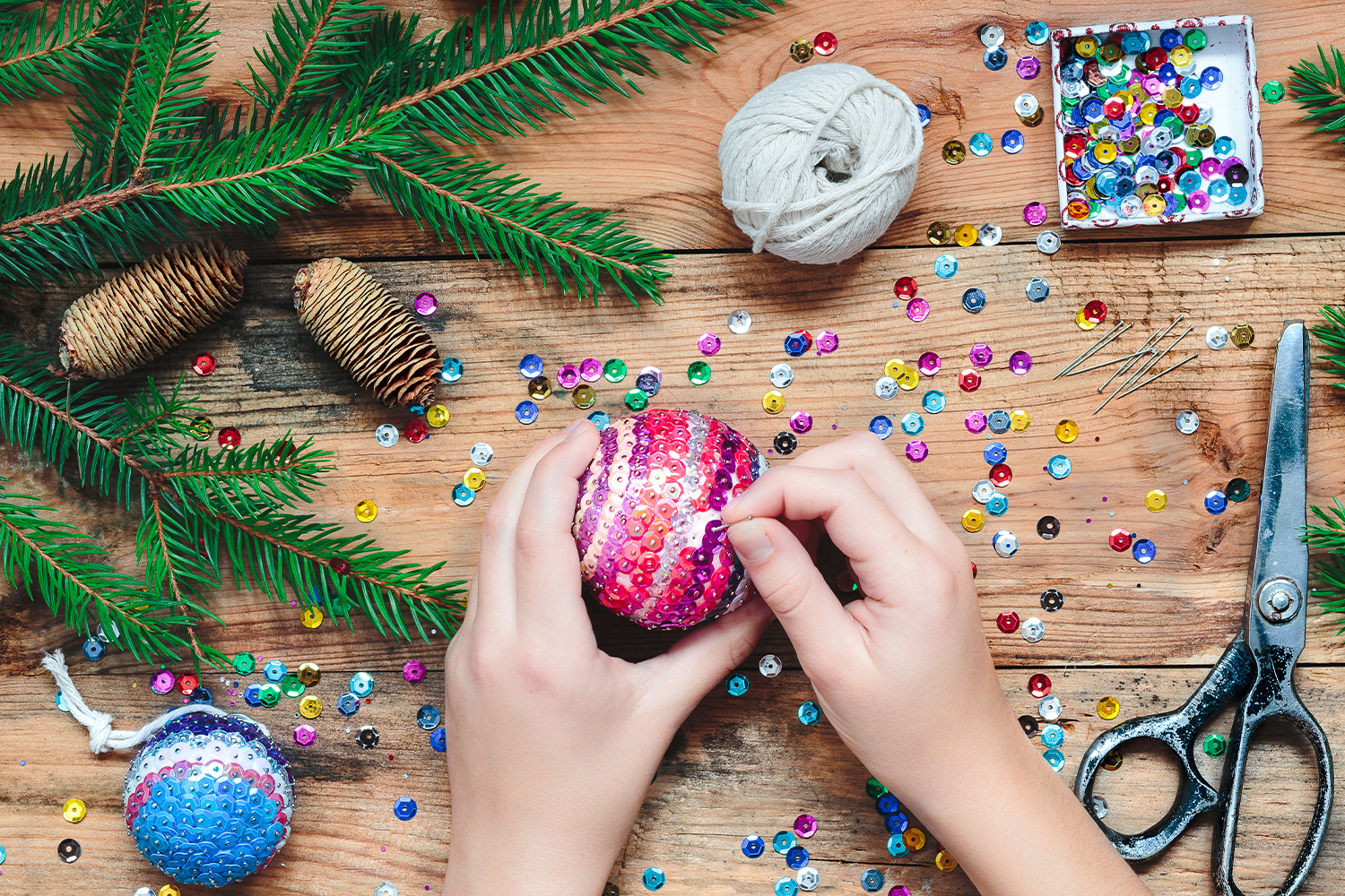 Technique: Thread a sequin onto a pin and pierce it into the polystyrene support. Repeat as necessary, ensuring that each sequin slightly overlaps its neighbor to ensure complete coverage of the entire surface of your polystyrene object.