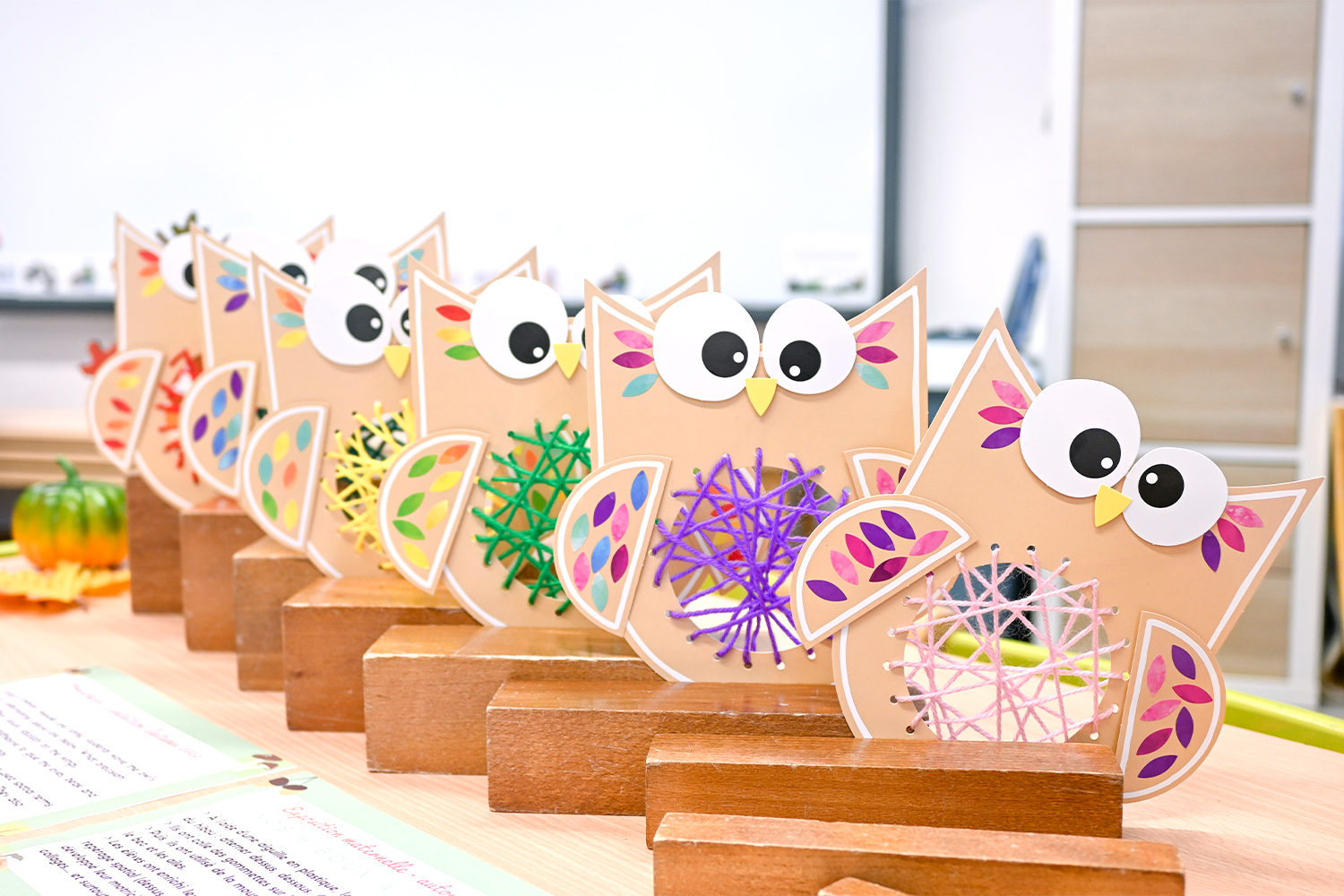 Each owl, made from sturdy cardboard, can be personalized with sticking elements (eyes, beaks, wings) and colorful threads. A playful and educational activity that promotes precision and creativity.