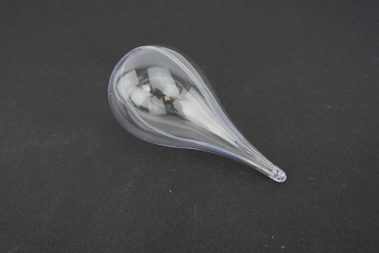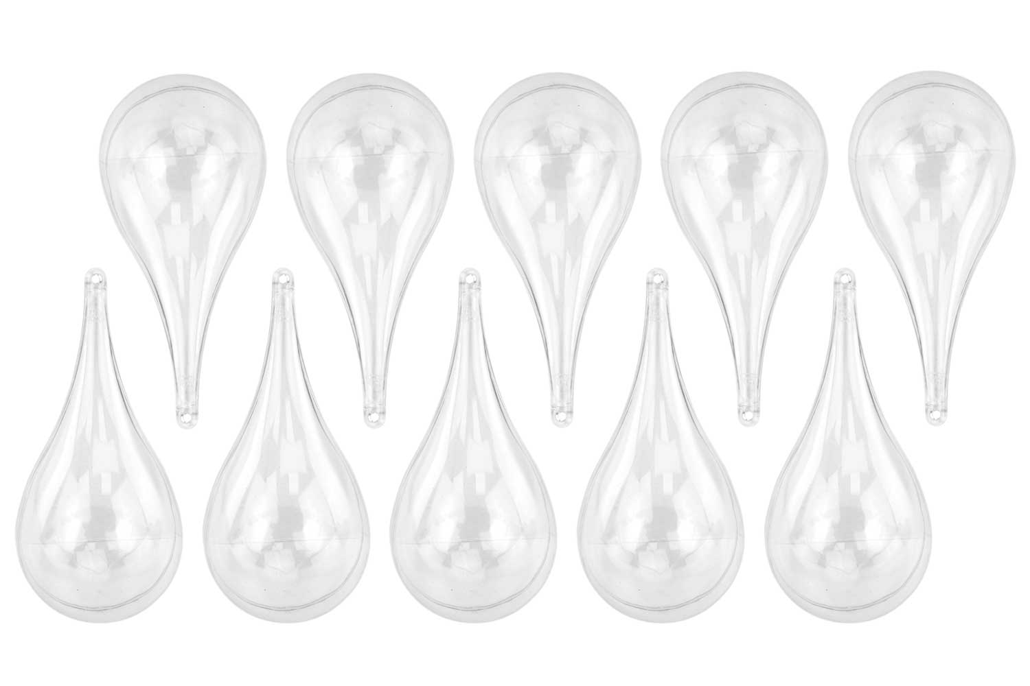 Transparent plastic drop-shaped ornaments. Open the ball to insert surprises, chocolates, colored papers, etc. Then hang these lovely decorations on the tree.