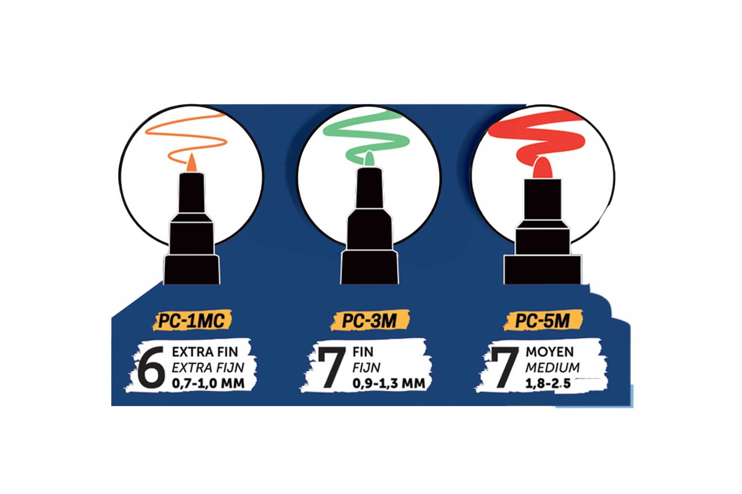 - 7 medium tip markers (PC5M): yellow, dark green, blue, red, white, black, pink.