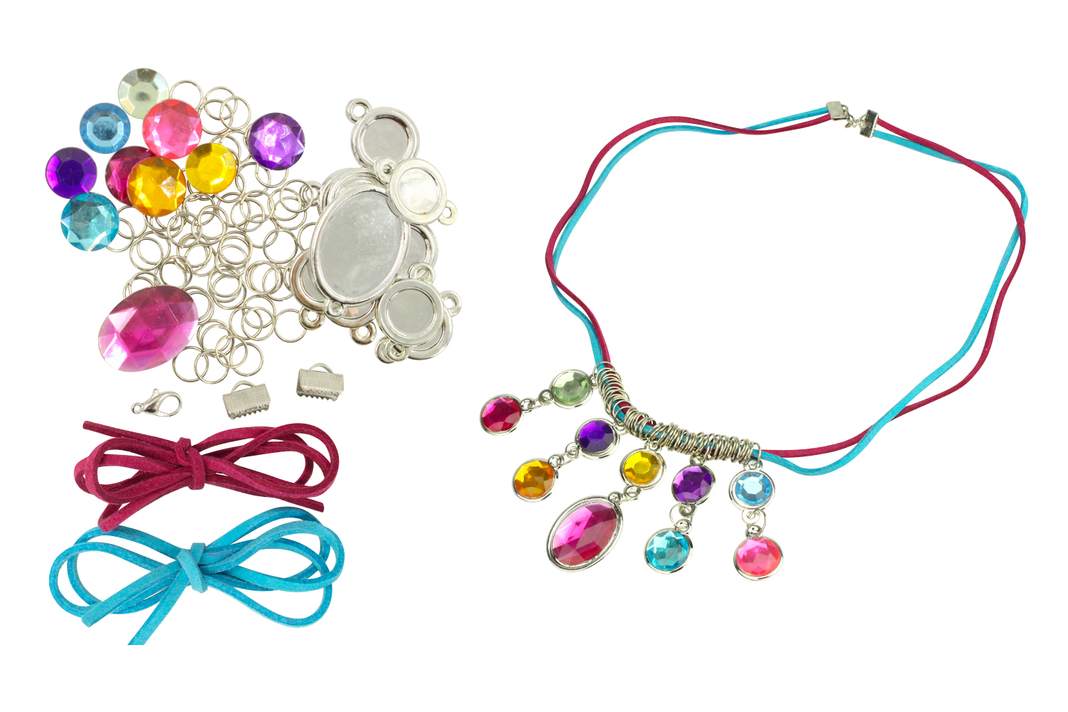 Create a necklace worthy of a queen or a princess! Glue the rhinestones onto their silver supports, link them with rings, and slide them onto the suede cords. Finish with the end caps and clasp... and shine!
