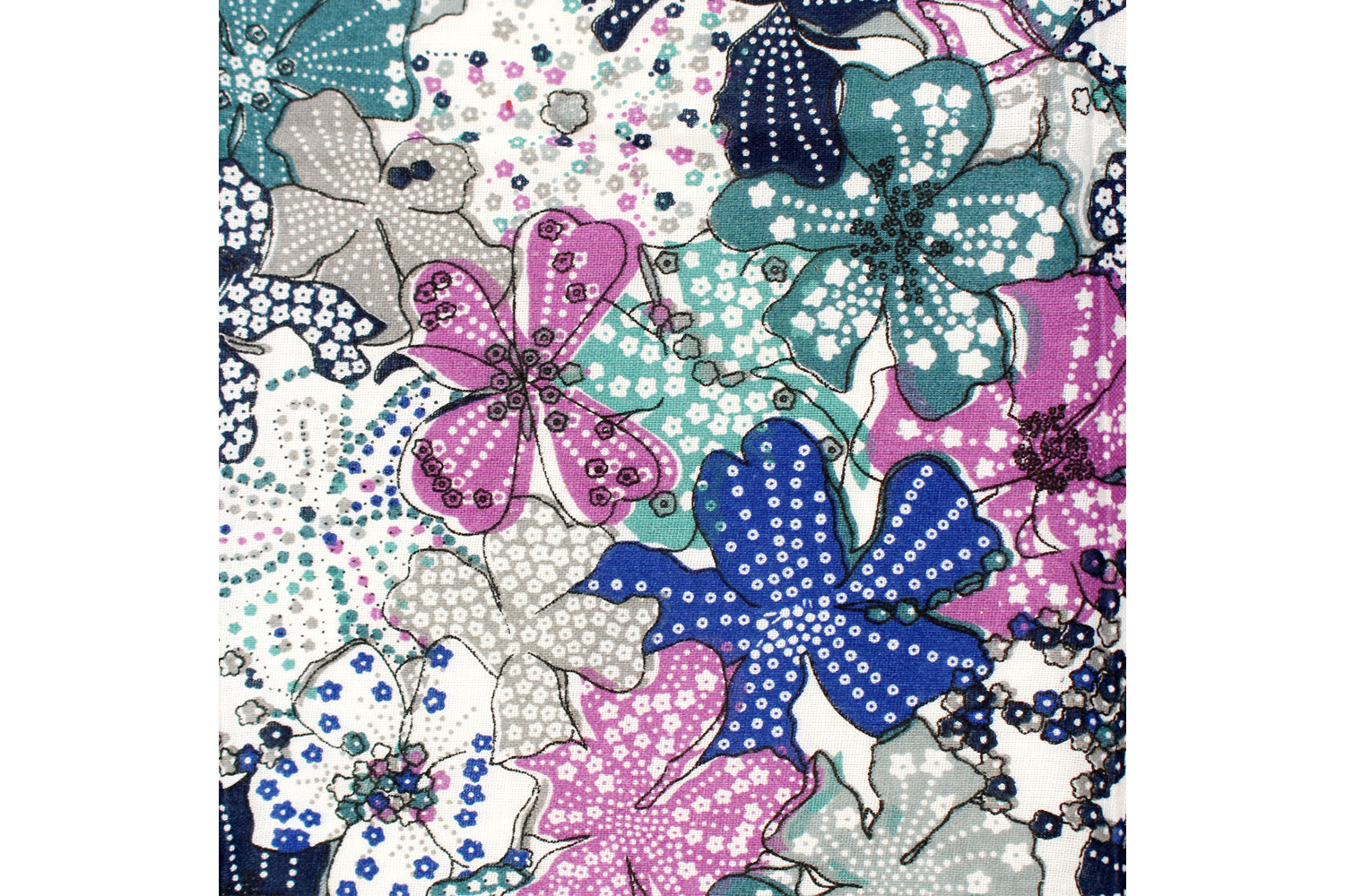 Large cotton fabric coupon for all types of sewing projects. Features large floral patterns in blue, violet, and mauve, perfect for creating beautiful sewing pieces, patchworks, and embroidery.