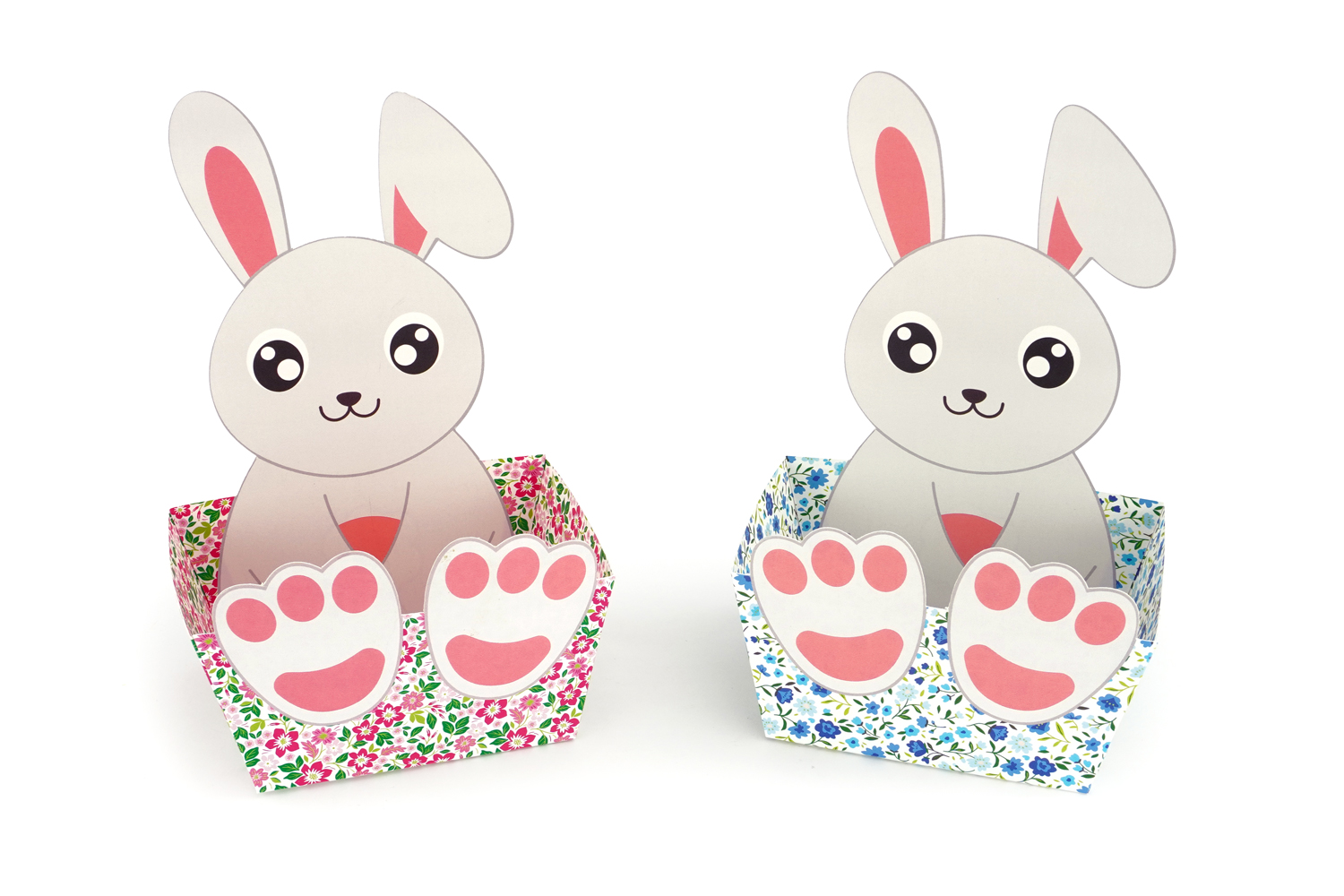 Set contents: 4 sturdy cardboard baskets with floral patterns and rabbit design