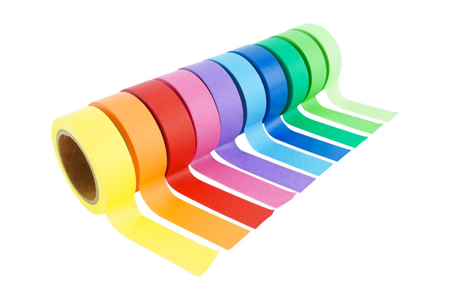 Assortment of 10 rolls of masking tape in solid colors of the rainbow. A beautiful assortment that will be useful for all your creative projects.