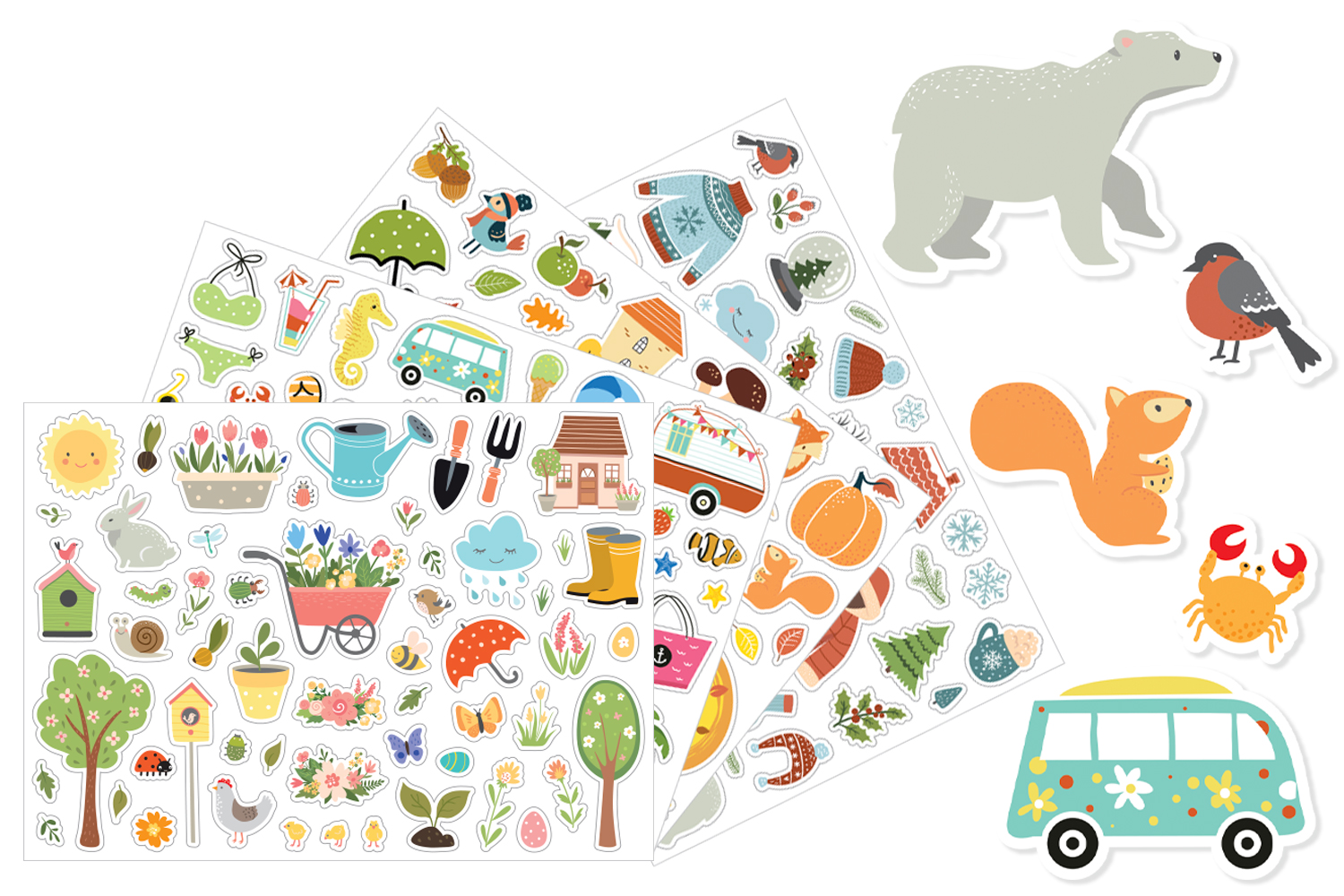 Colorful stickers with white outlines: each sheet corresponds to a season of the year (spring, summer, autumn, winter). Ideal for creating stories or learning about the seasons. Find animals, plants, and clothing that match each season. Perfect for learning while having fun!