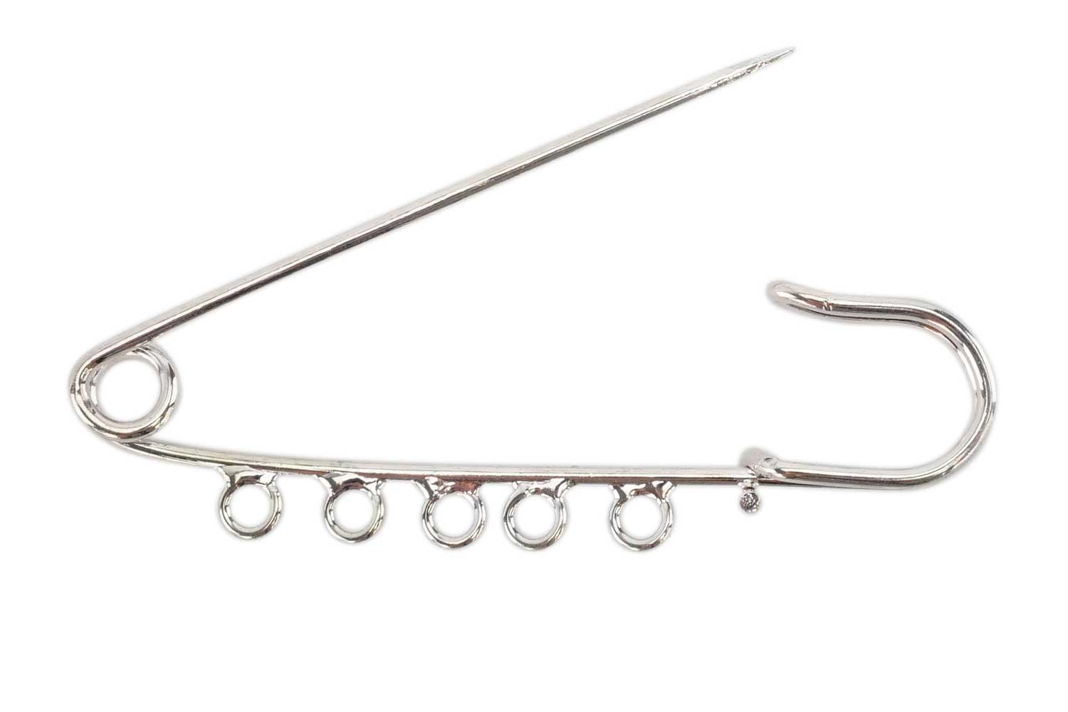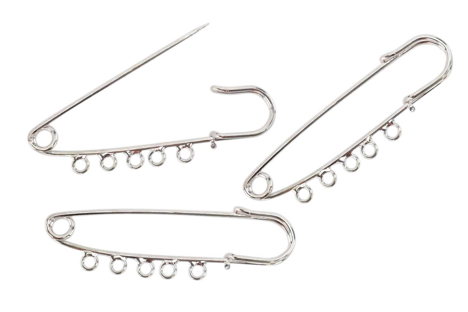 Large customizable safety pins. These safety pins are adorned with 5 rings. Hang beads or charms on each ring to create a personalized brooch. Ideal for jewelry making.