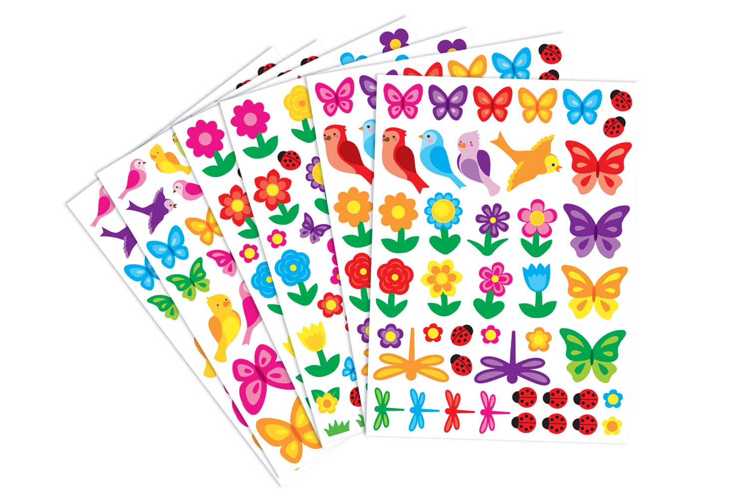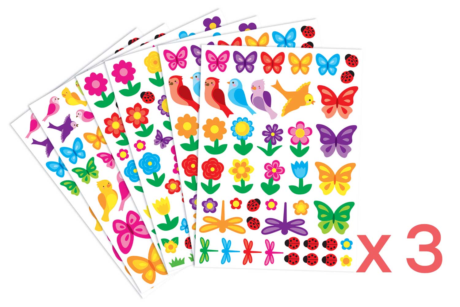 These 6 sheets (3 different designs x 2) contain 260 stickers representing flowers, butterflies, birds, ladybugs, and dragonflies.