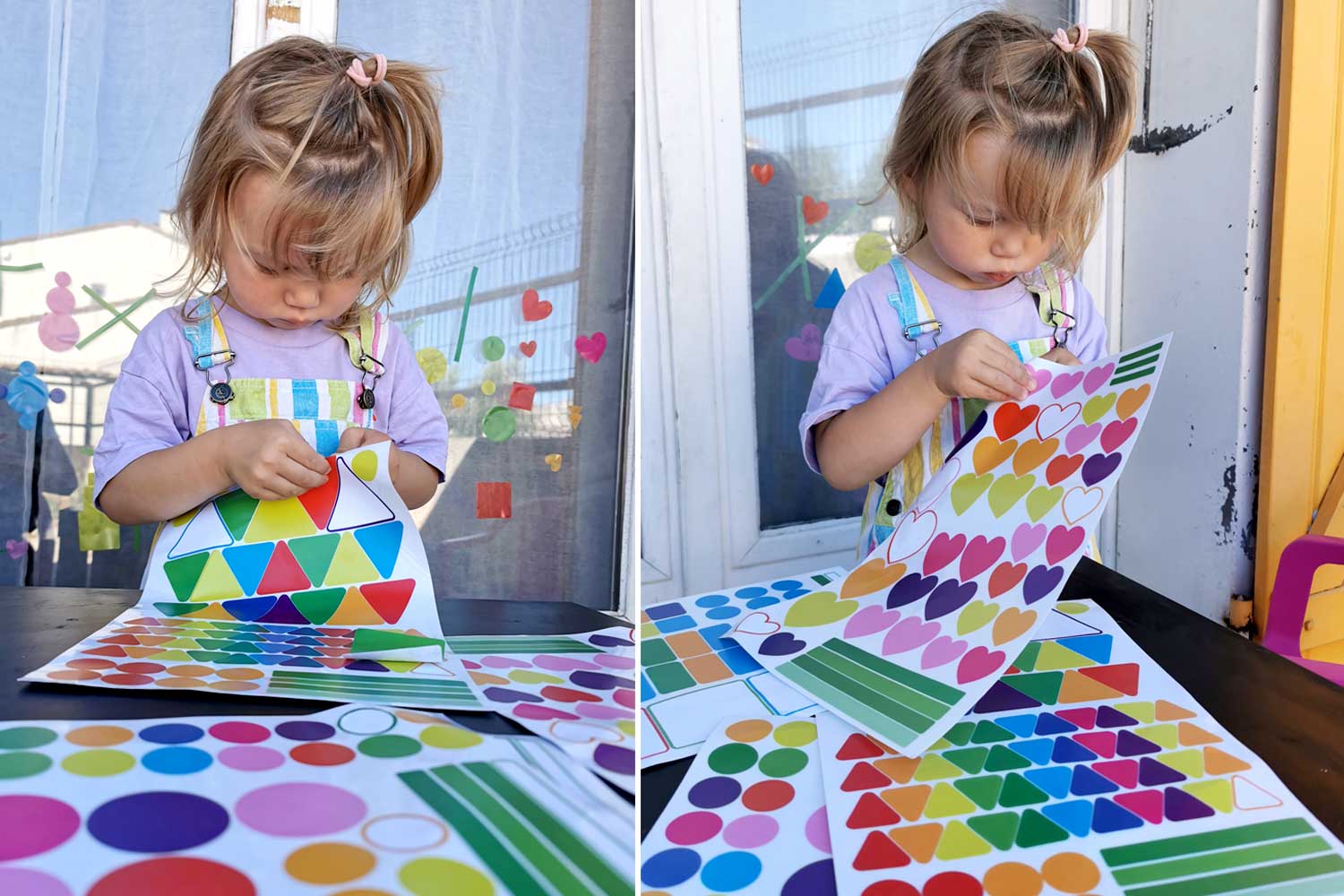 - 6 sheets of 20 x 30 cm with an assortment of squares, triangles, circles, hearts, rods of different sizes and colors.