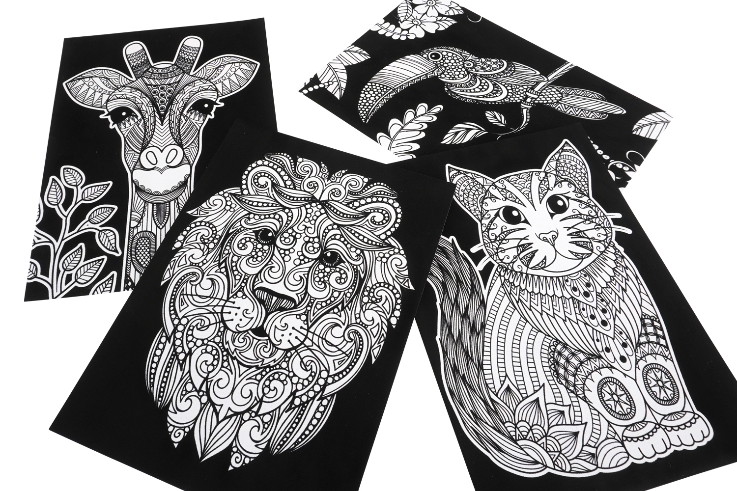 A true moment of relaxation and creativity with these beautiful velvet coloring pages featuring animal motifs! Each sheet showcases a stylized animal (lion, cat, giraffe, toucan) in a richly detailed graphic universe, perfect for precise and relaxing coloring.