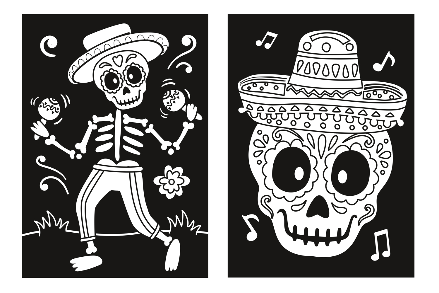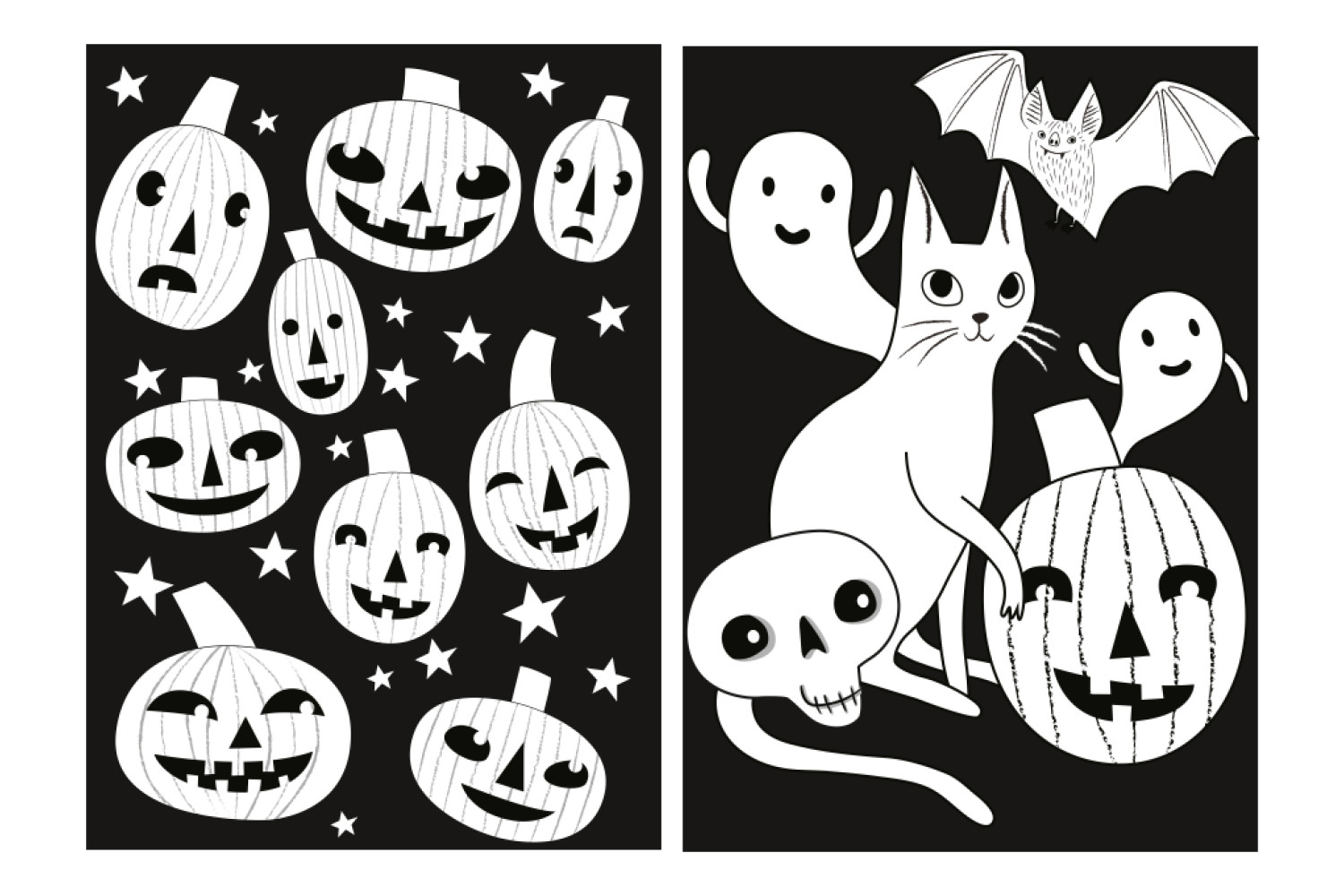 With a soft black background, these coloring pages are perfect for ensuring flawless creations, even in case of smudging. The fun patterns, such as pumpkins, a black cat, skeletons, bats, and more skeletons, spark the imagination while developing fine motor skills.
