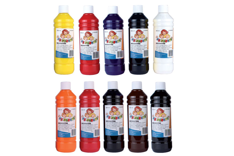 Transparent color paint (except for white, which is opaque) that allows you to create temporary decorations on the inside of your windows and glass. It can be applied directly with a brush, roller, or sponge. The paint sticks directly to the surface without running. Highly appreciated for its easy cleaning (even after a few weeks) by simply scraping off the paint or rubbing with a cloth or damp sponge.