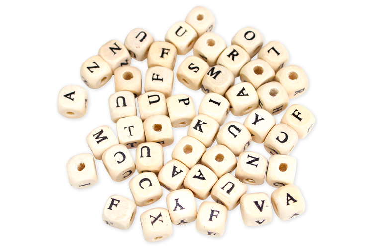 Square wooden beads with printed letters for creating personalized jewelry, bracelets, pacifier clips... These natural-colored square wooden beads have black letters printed on each side and feature large holes that are very convenient for children !