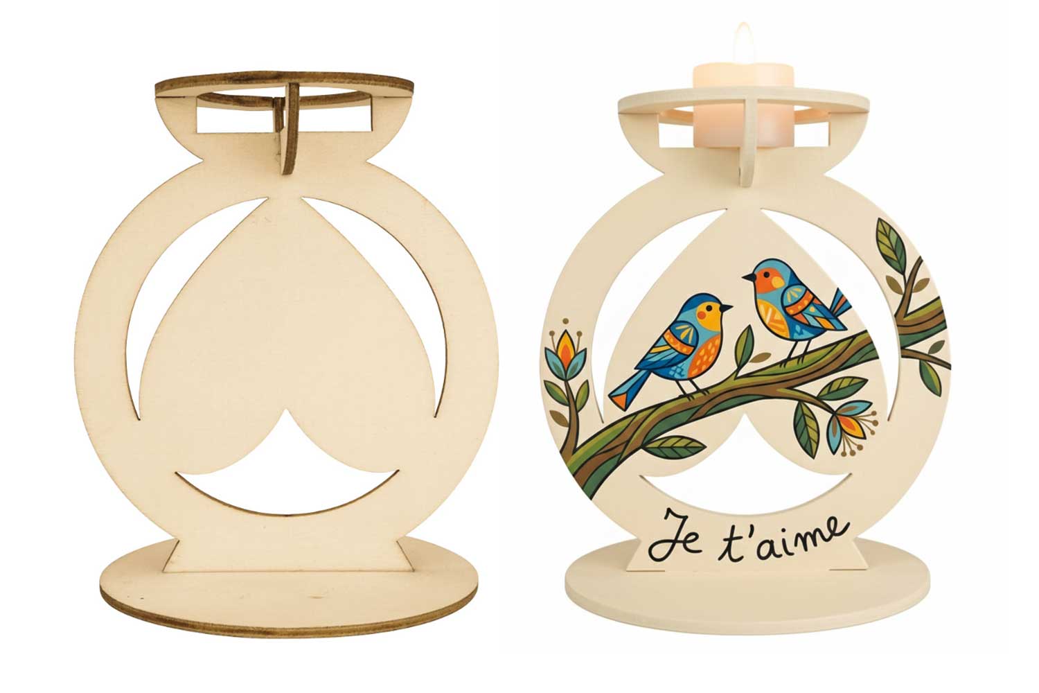 Wooden candle holders to assemble with an "inverted heart" shape in the center for decorating. Ideal for placing a photo or decorating with stickers, paint, or other materials...