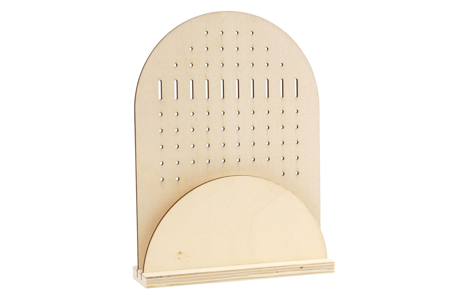 Organize your jewelry elegantly with this raw wooden earring display stand, a practical and aesthetic support for all your creations. This stand consists of a grooved wooden base, a perforated panel, and a decorative semicircle. With its many holes and precise notches, it allows you to hang your favorite pairs of earrings: hoops, dangles, or studs.