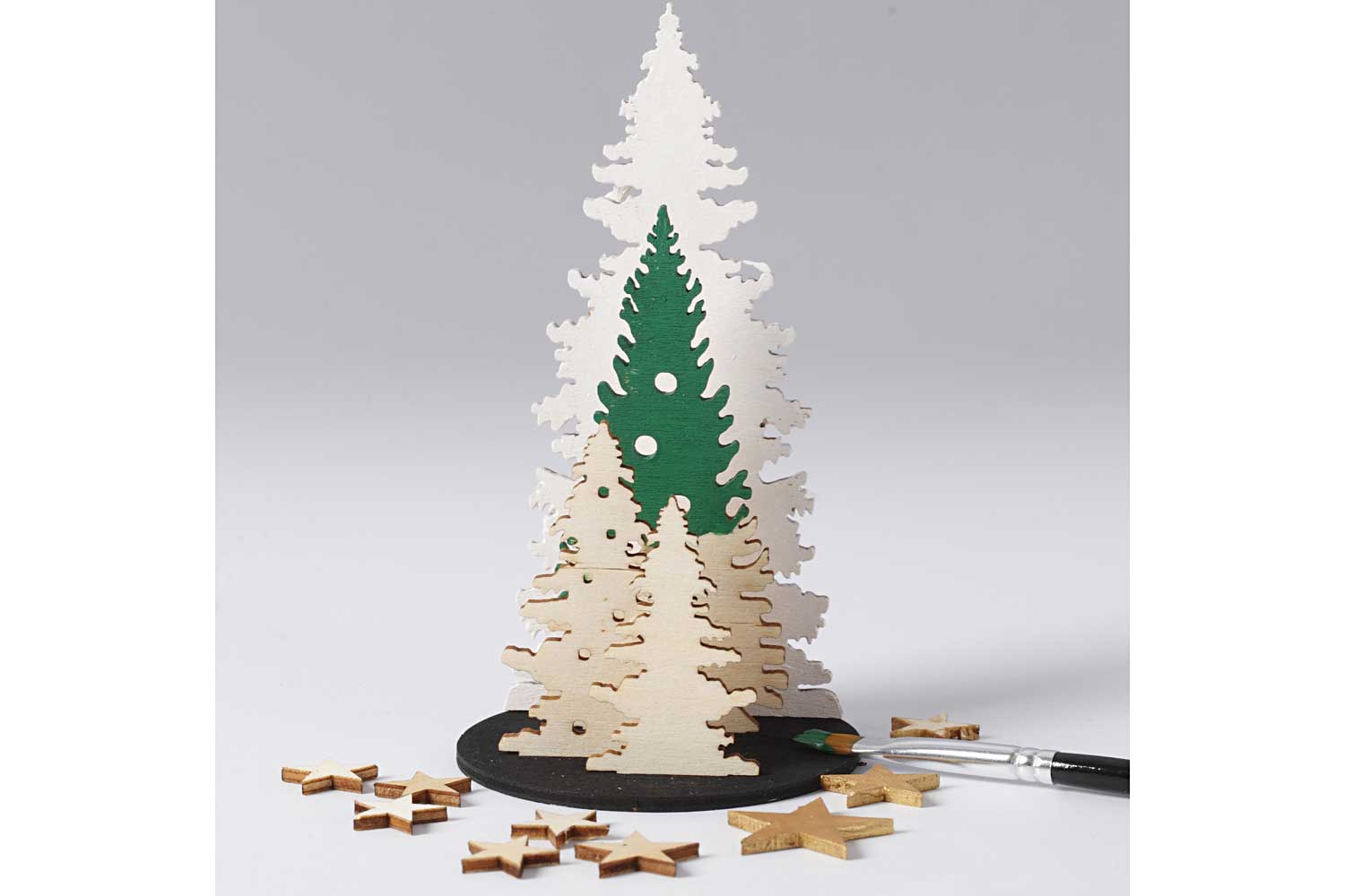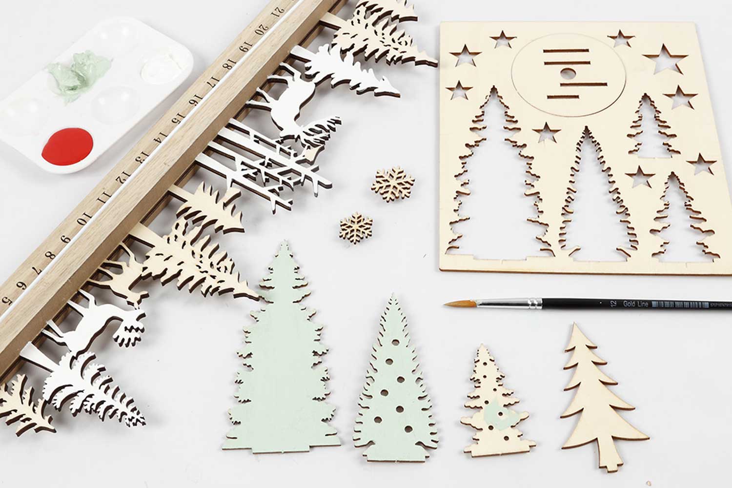 Wooden figurines, with pine trees and stars, to create enchanting Christmas decorations. Perfect for making miniature Christmas villages, or for decorating the nativity scene. Paintable or left uncoated for a natural style.