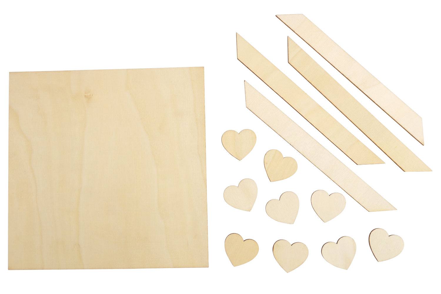 This kit allows you to create a relief wall art piece where nine small wooden hearts become a canvas for free artistic expression.
